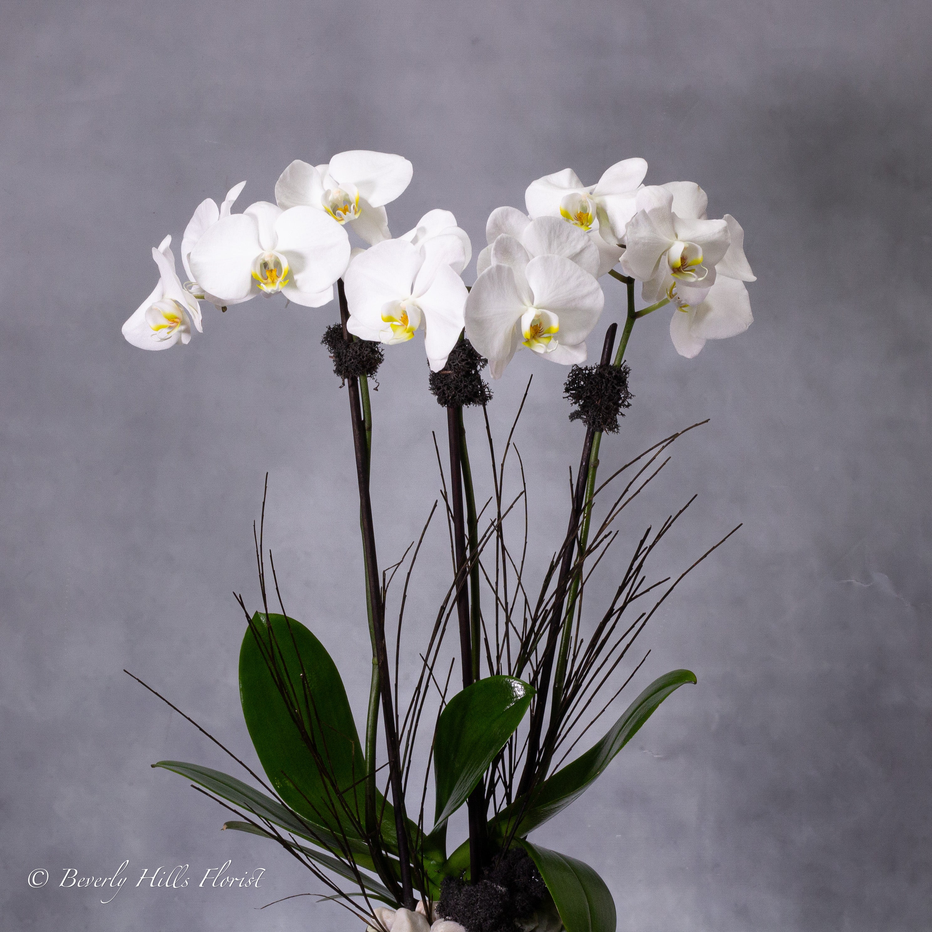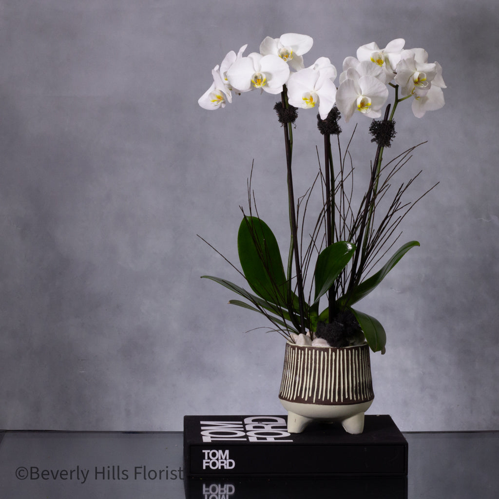 For same-day delivery, elevate your space with the timeless allure of Petal Whispers – Orchid’s Essence, a botanical masterpiece suited for both office spaces and home environments. Delicately set in a modern black-and-white ceramic vase, this exquisite orchid stands 35″ tall, featuring blossoms that gracefully illuminate any room. Available in Standard (3 spikes) and Grand (6 spikes), this arrangement is perfect for adding tranquility and refinement to your space. Ideal for sympathy, thank-you gestures, and long-lasting elegance.