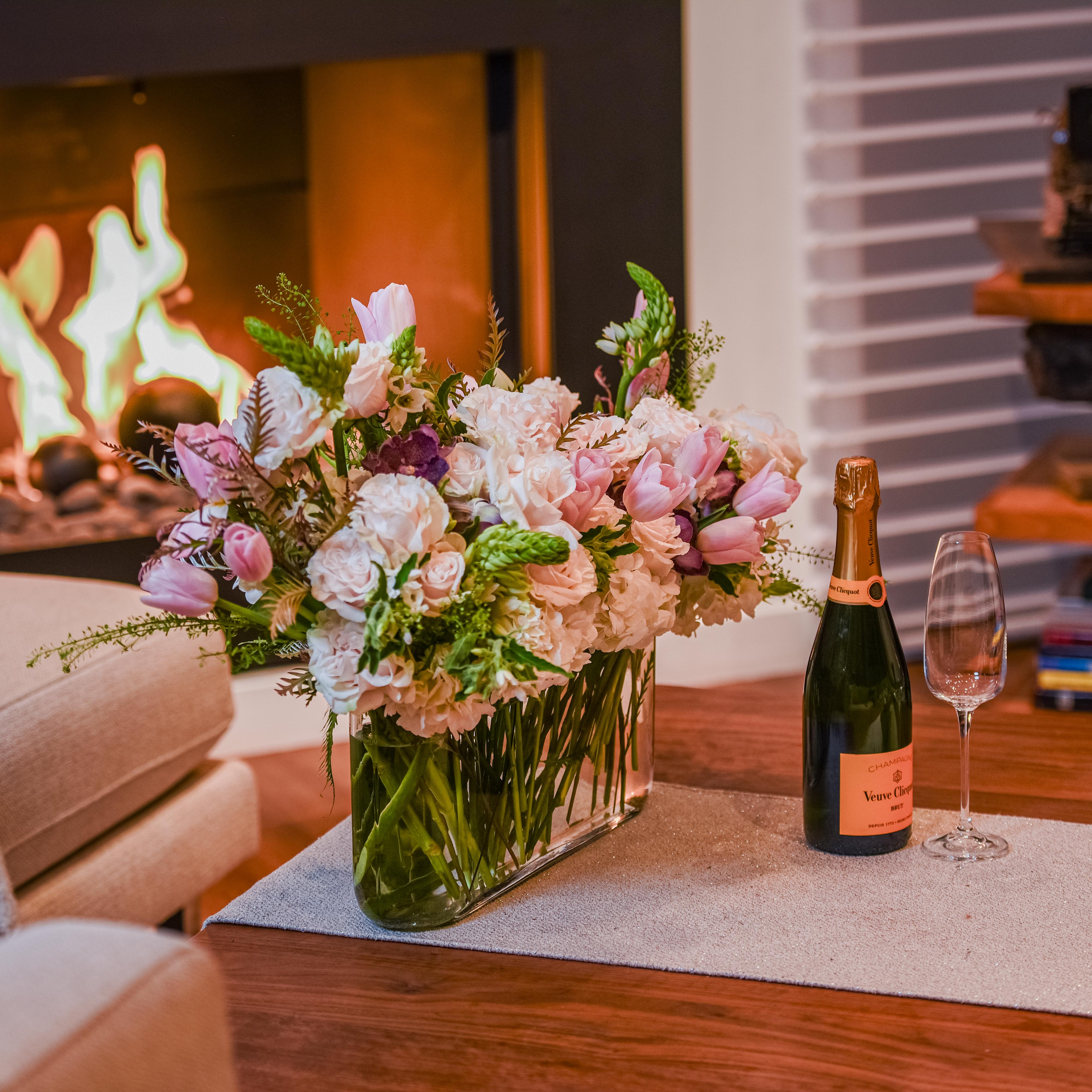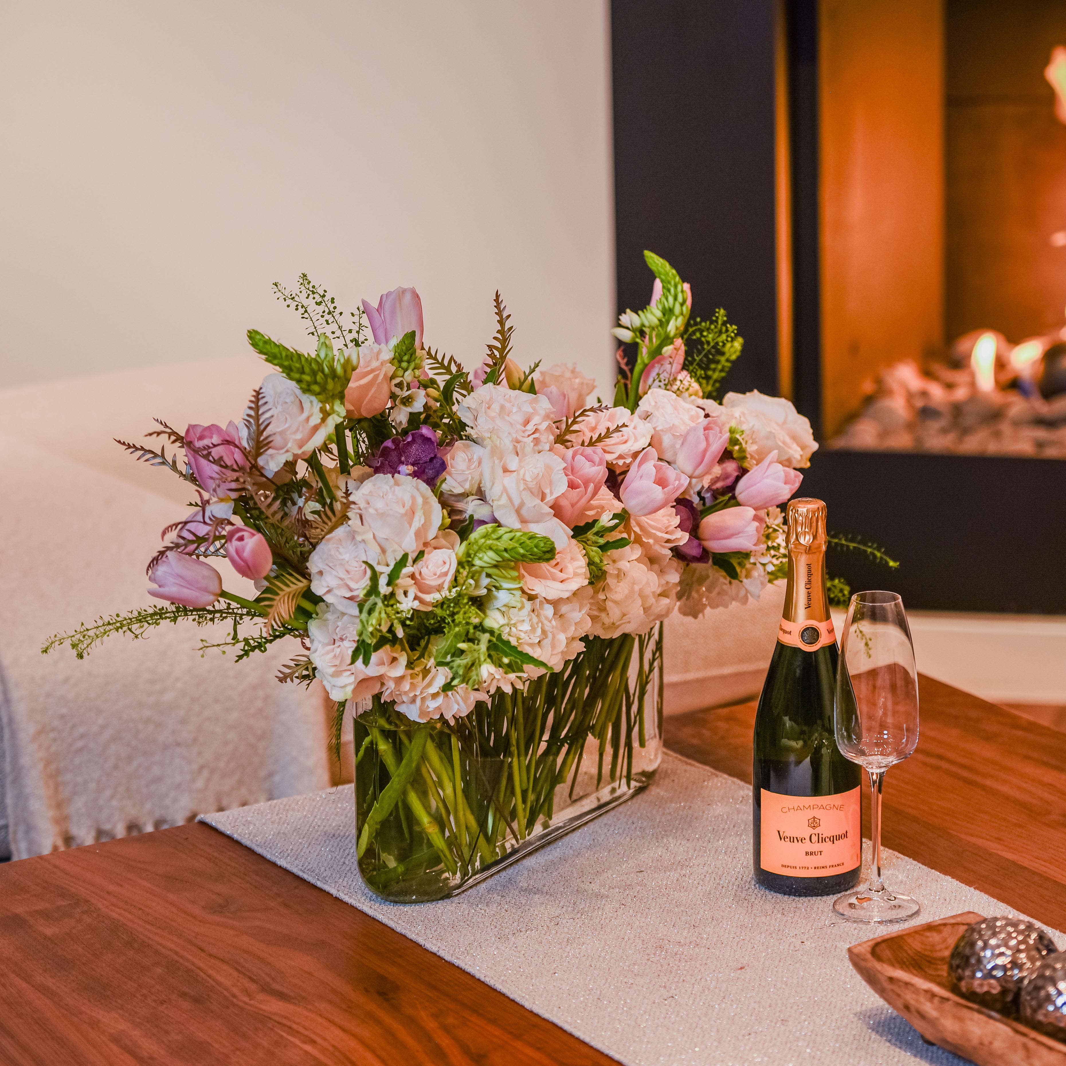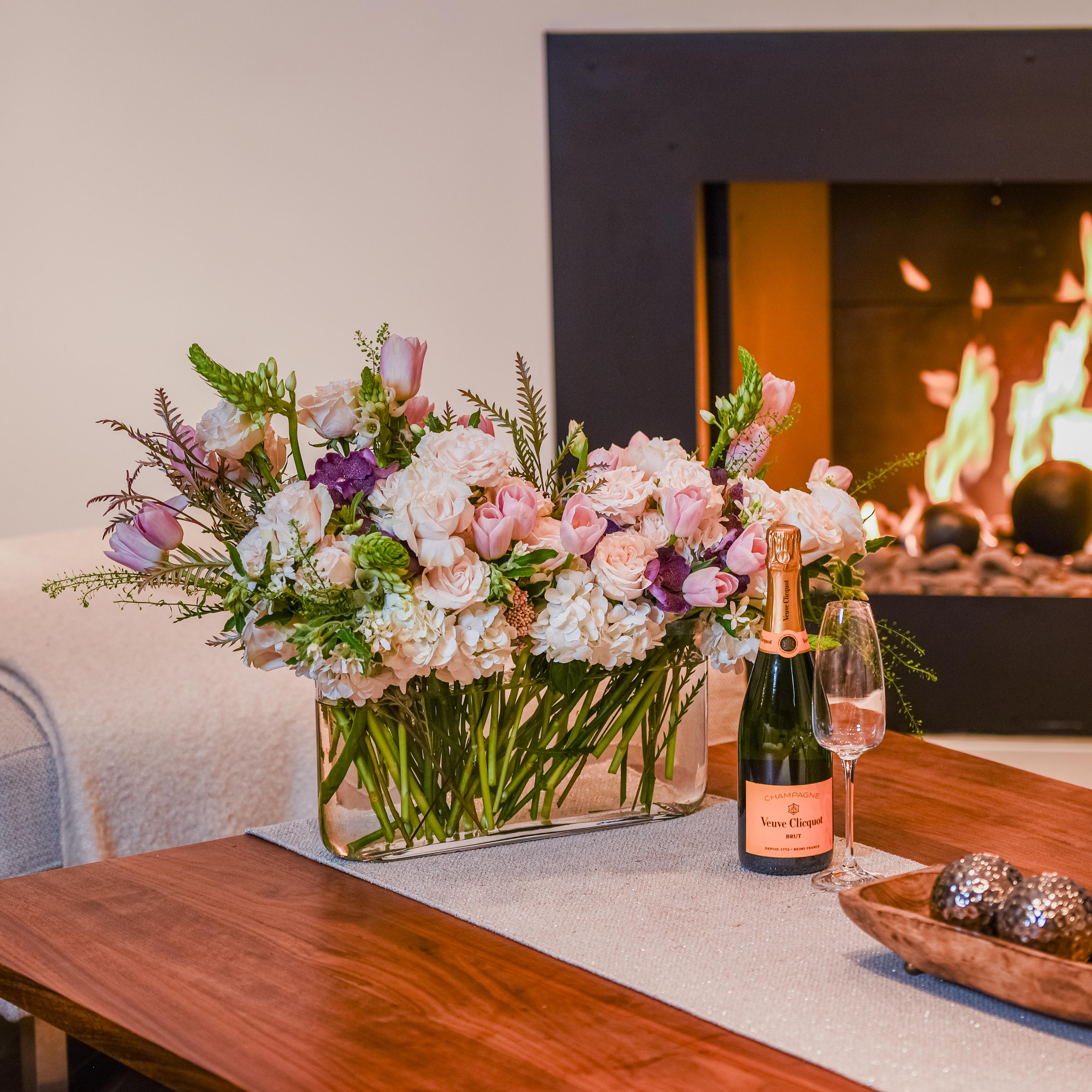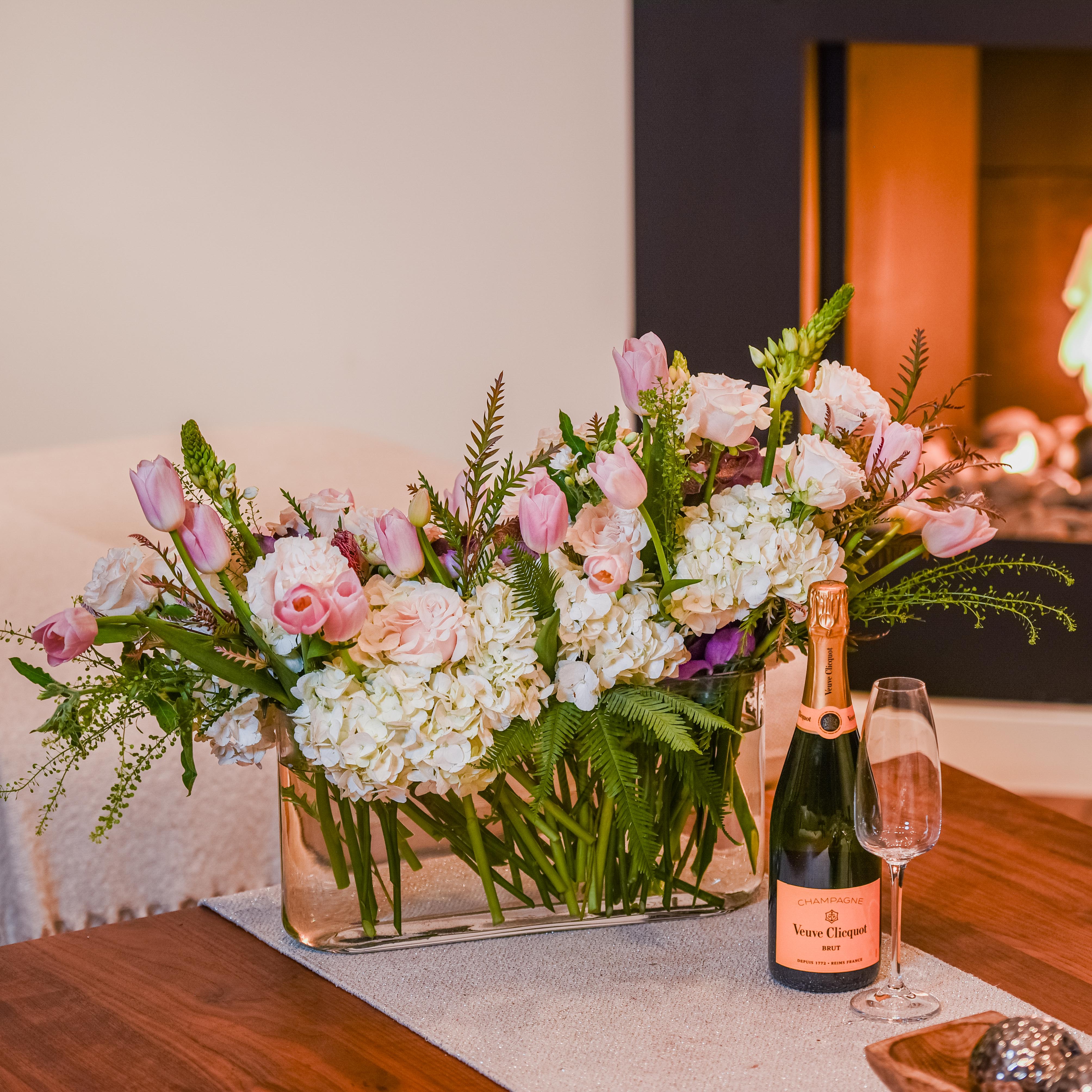 Delight in the enchanting beauty of our Floral Harmony arrangement, gracefully showcased in a clear glass rectangular vase. White hydrangeas form the centerpiece, their voluminous blooms exuding a sense of purity and tranquility. Intertwined with seasonal spray pink roses and tulips, the arrangement bursts with vibrant hues, evoking the essence of spring’s abundant beauty. Whether adorning a tabletop or brightening a mantelpiece, let this arrangement infuse your space with a symphony of elegance and joy.