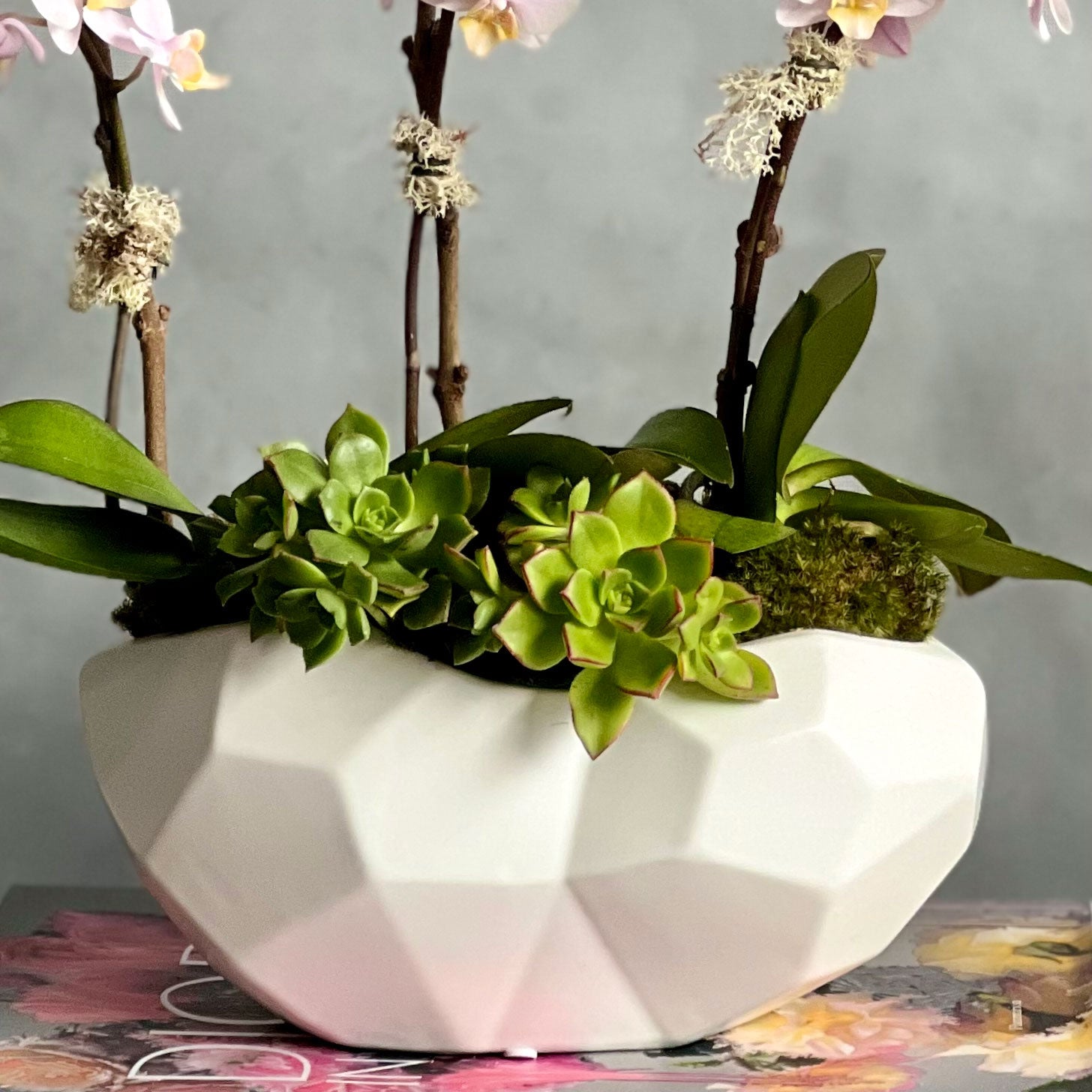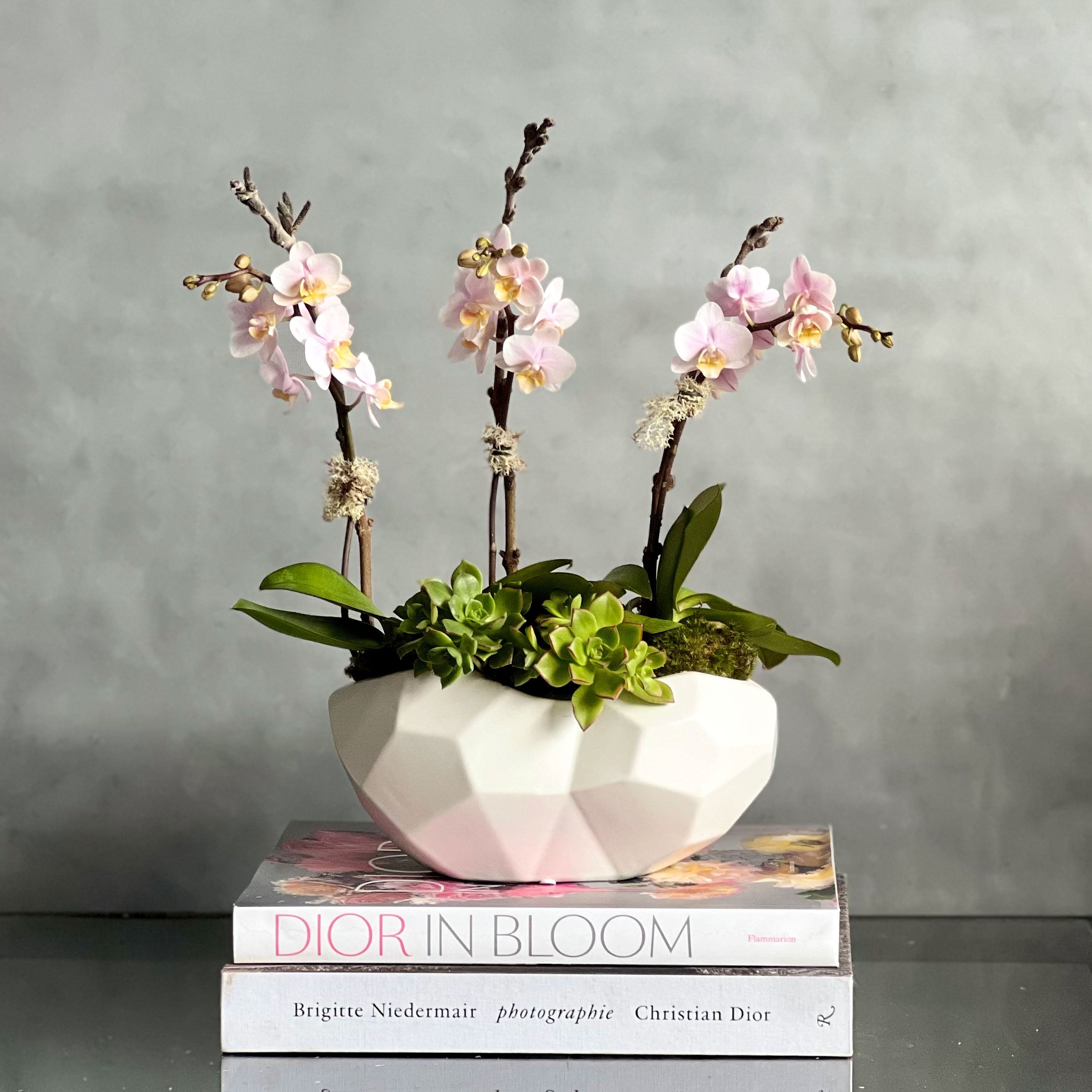 Our “Touch of Pink” is arranged within a small geometric ceramic vase accented with two succulents. Inside is 3 single stem mini pink Orchids that make for a beautiful Thank you, just because and thinking of you.