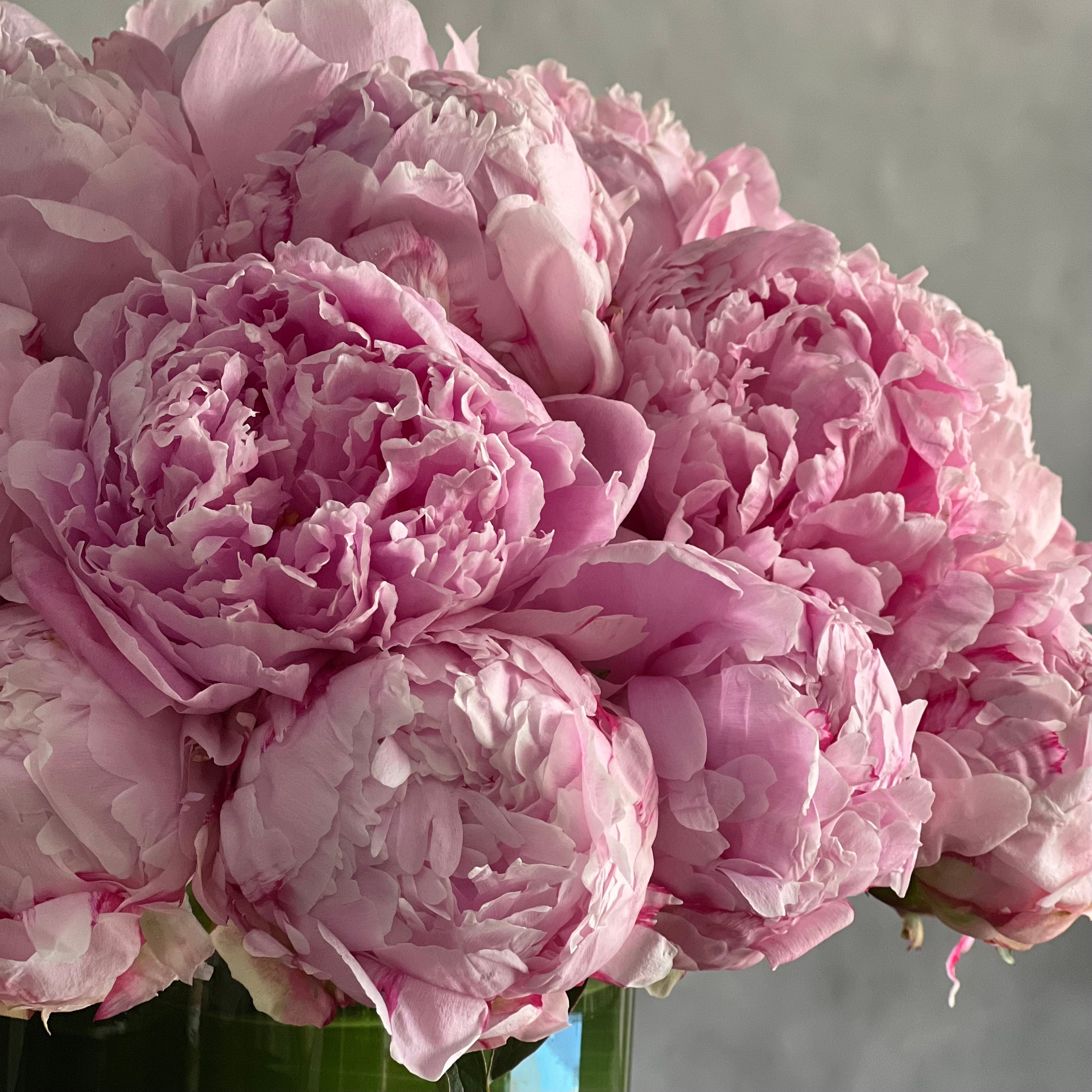 Imagine for SAME DAY DELIVERY a radiant bouquet of pink peonies, expertly arranged in a pave style to create a lush and opulent display. Each delicate bloom is carefully nestled together, creating a breathtaking harmony of color and texture. The soft, blush petals of the peonies exude a sense of elegance and grace, while their sweet fragrance fills the air with a subtle, yet enchanting aroma.