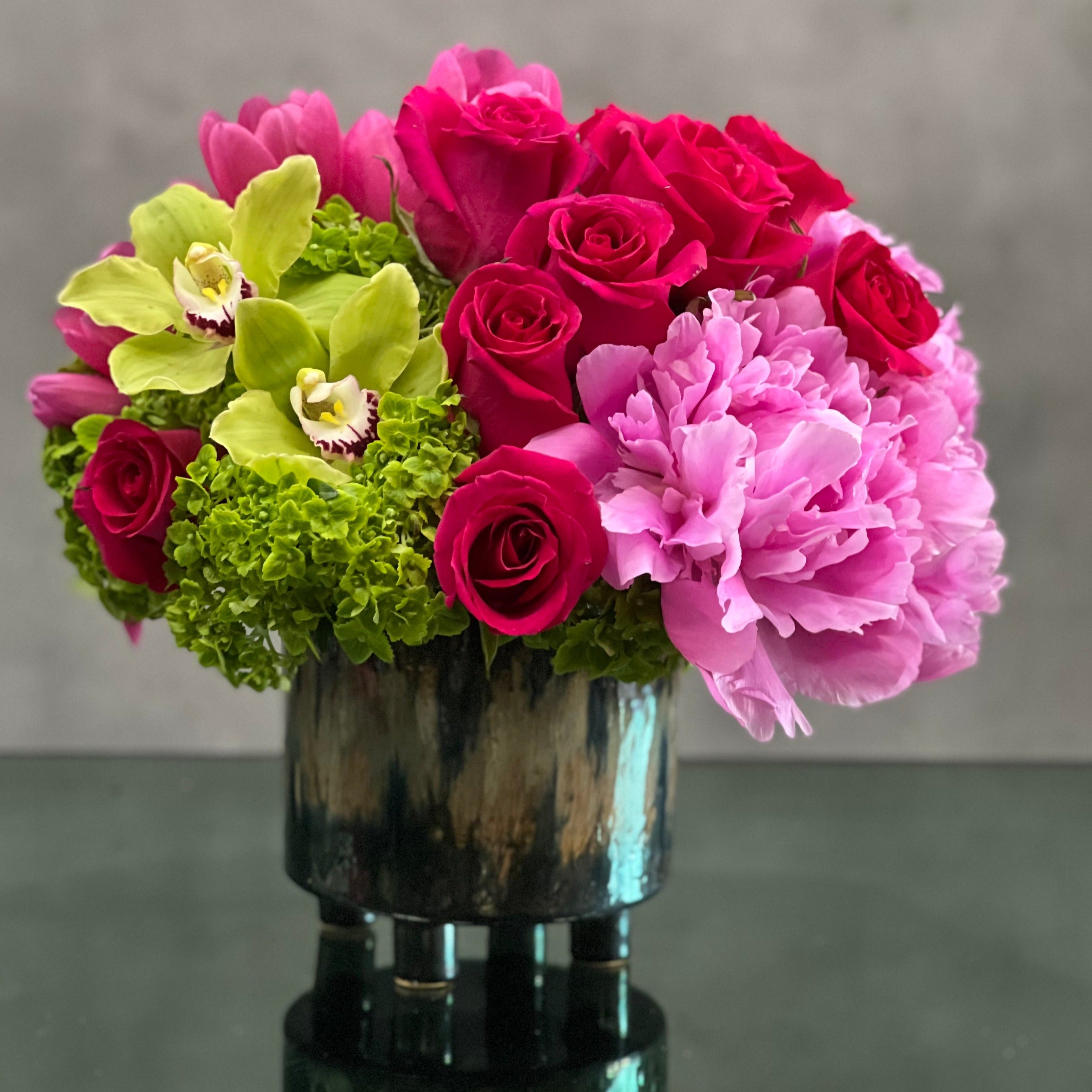 This delightful arrangement presented by Beverly Hills Florist is an artistic combination of pink floral favorites. Our team can arrange this piece to be delivered in the same day ! Our floral arrangement includes, Delicate Roses, Cymbidium Orchids, and wax flowers sit delicately atop a ceramic vase. A kind gesture for a Thank you or Love and Romance.