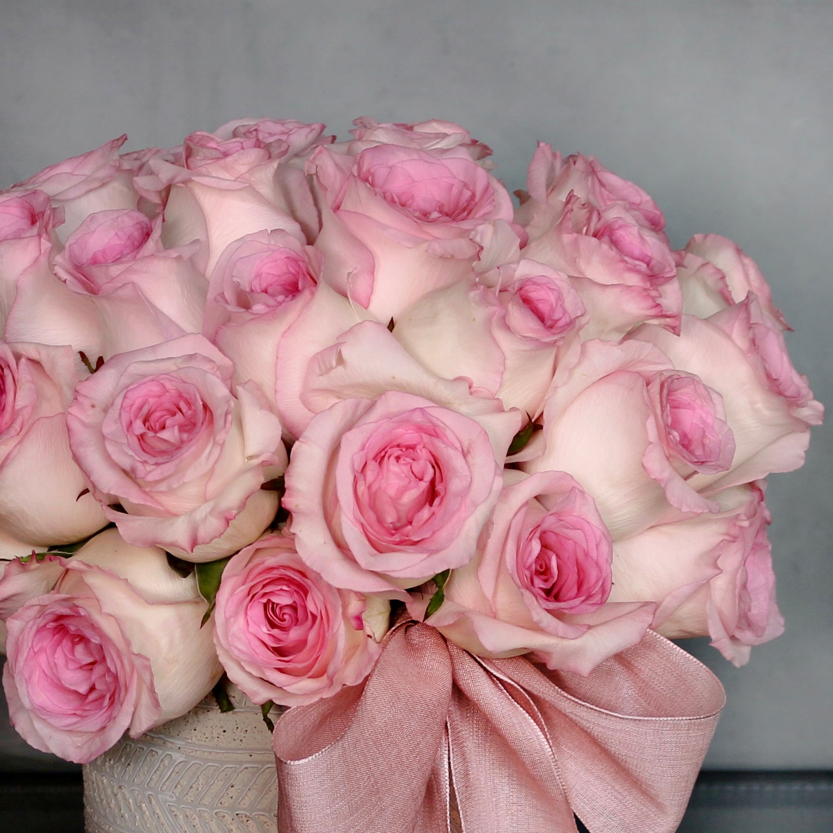 “Princess” is a sweet and small pave arrangement made with about 3 Dozen pink Roses. All made within a white ceramic print vase and accented with a pink ribbon.