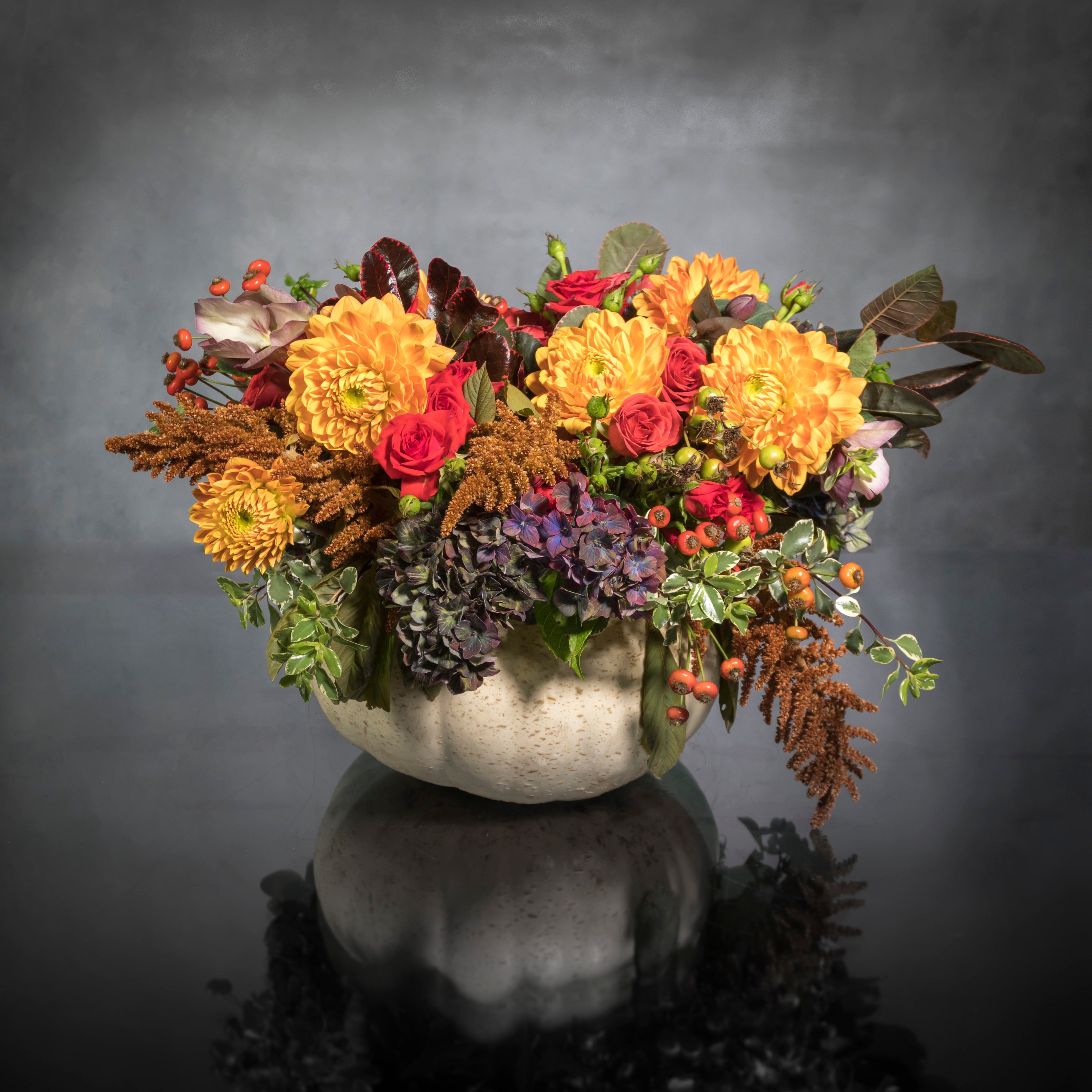 This charming pumpkin arrangement makes the perfect accent for any holiday party or centerpiece, guaranteed to bring a smile to that special someone. Featuring a white pumpkin, vibrant orange dahlias, fall-colored hydrangeas, and seasonal greens, it captures the essence of autumn. For an even more impressive display, the **Premium** option comes as a set of two, doubling the festive impact.