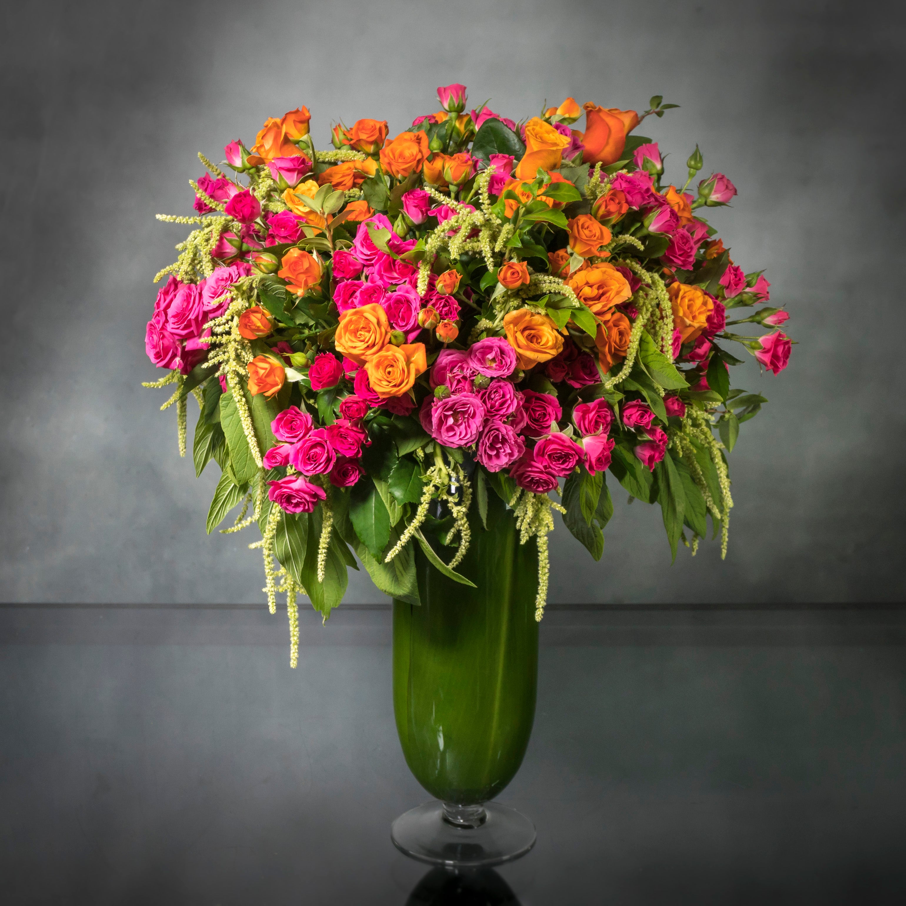 A vibrant mix of gorgeous orange and hot pink Roses in a full 7″ globe shape. Fill their day with color with this lovely arrangement!