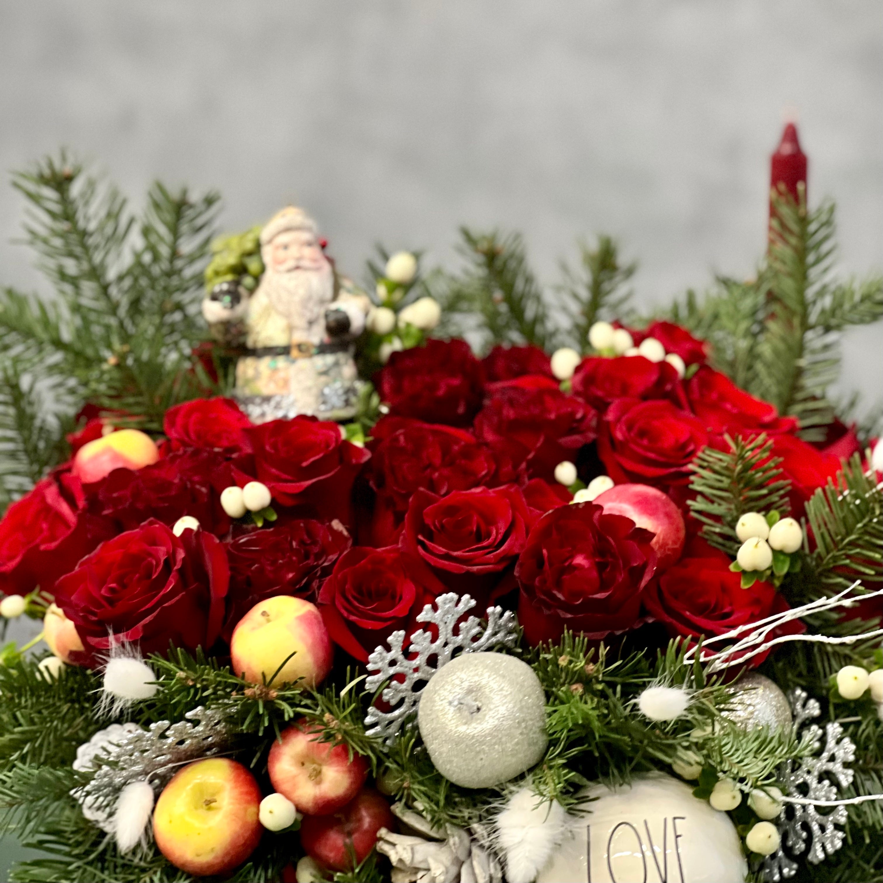 Celebrate the holidays with over 2 dozen fresh red roses, lush holiday greens, and festive berries arranged in a chic red box. Accented with ornaments for a unique touch. Dimensions: Overall: 18″ wide x 9″ tall; Box: 8″ x 4″. Order now for same-day delivery in Los Angeles and Beverly Hills!