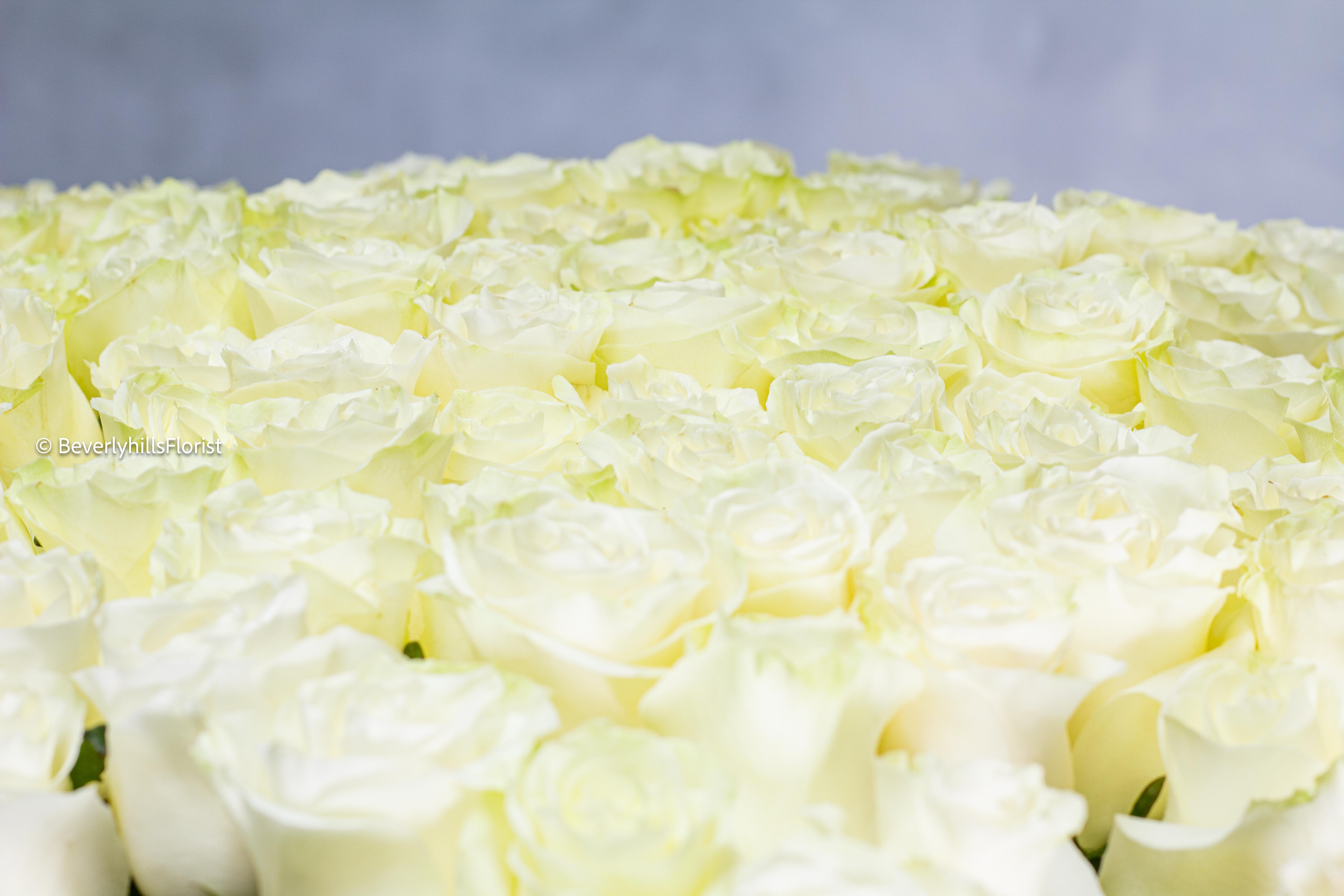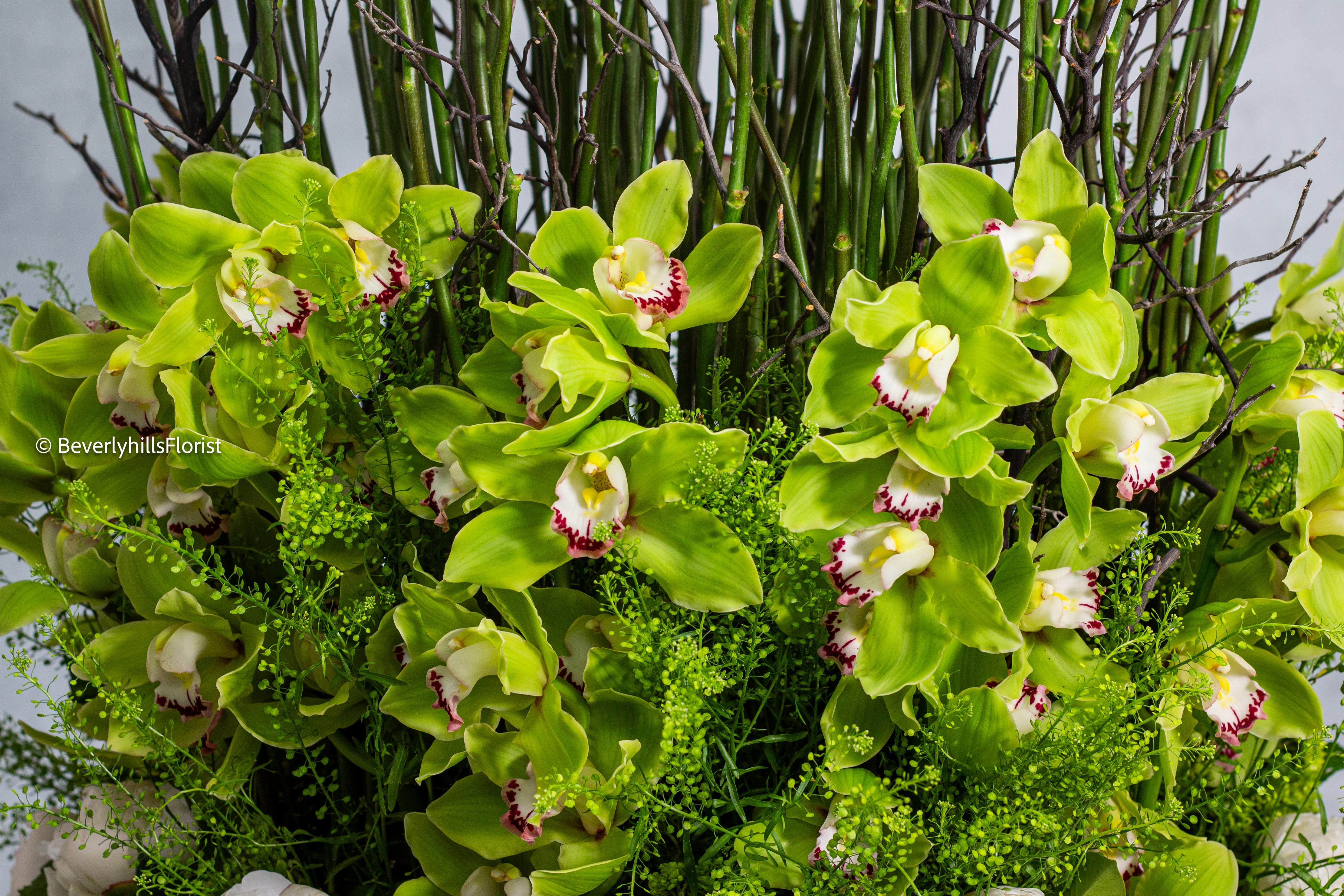 In a short, clear glass case, an exquisite blend of timeless elegance and modern sophistication takes center stage. Towering white long stem roses stand tall alongside lush white peonies, their petals unfurling with delicate grace. Interspersed among them, verdant green cymbidium orchids add a touch of exotic allure. This arrangement exudes a sense of purity and refinement, casting a spell of enchantment that captivates the senses.