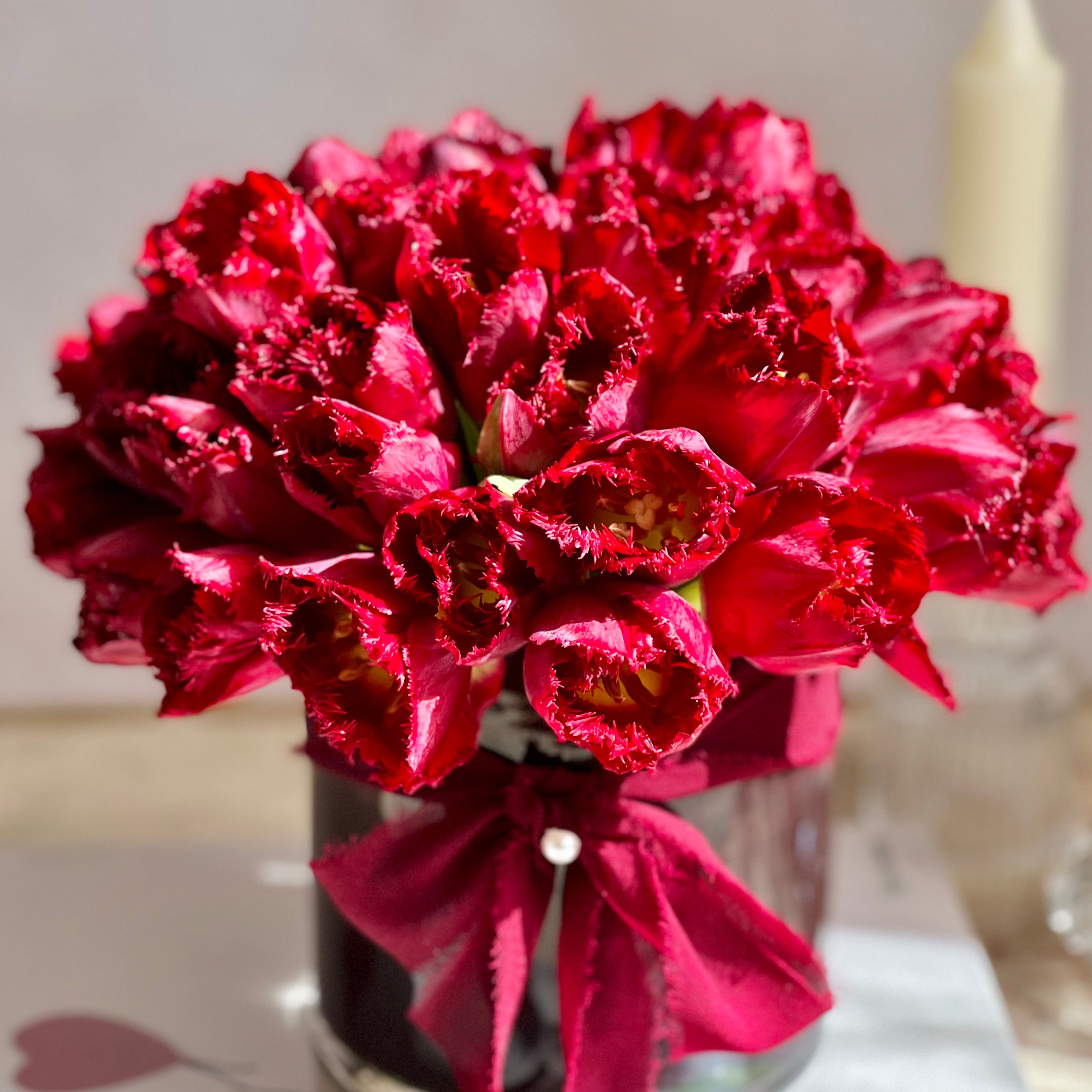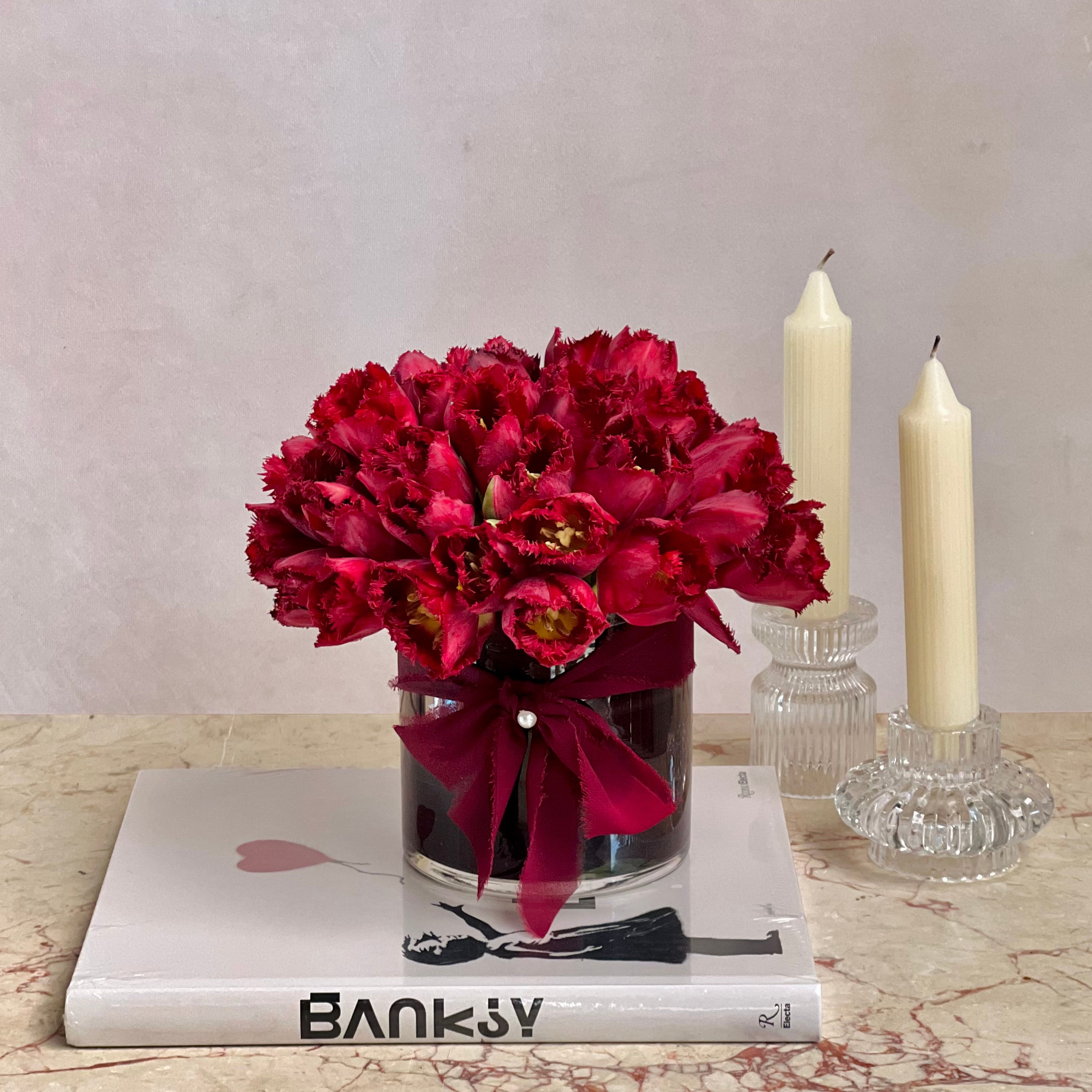 Our “Red Dawn” is perfect for any loving occasion, beautifully made for that special someone in your life. This arrangement consists of 50 Burgundy Dutch Fringe Tulips. Perfect for an I Love You ! Accented in a glass vase tied off with a silk red ribbon.