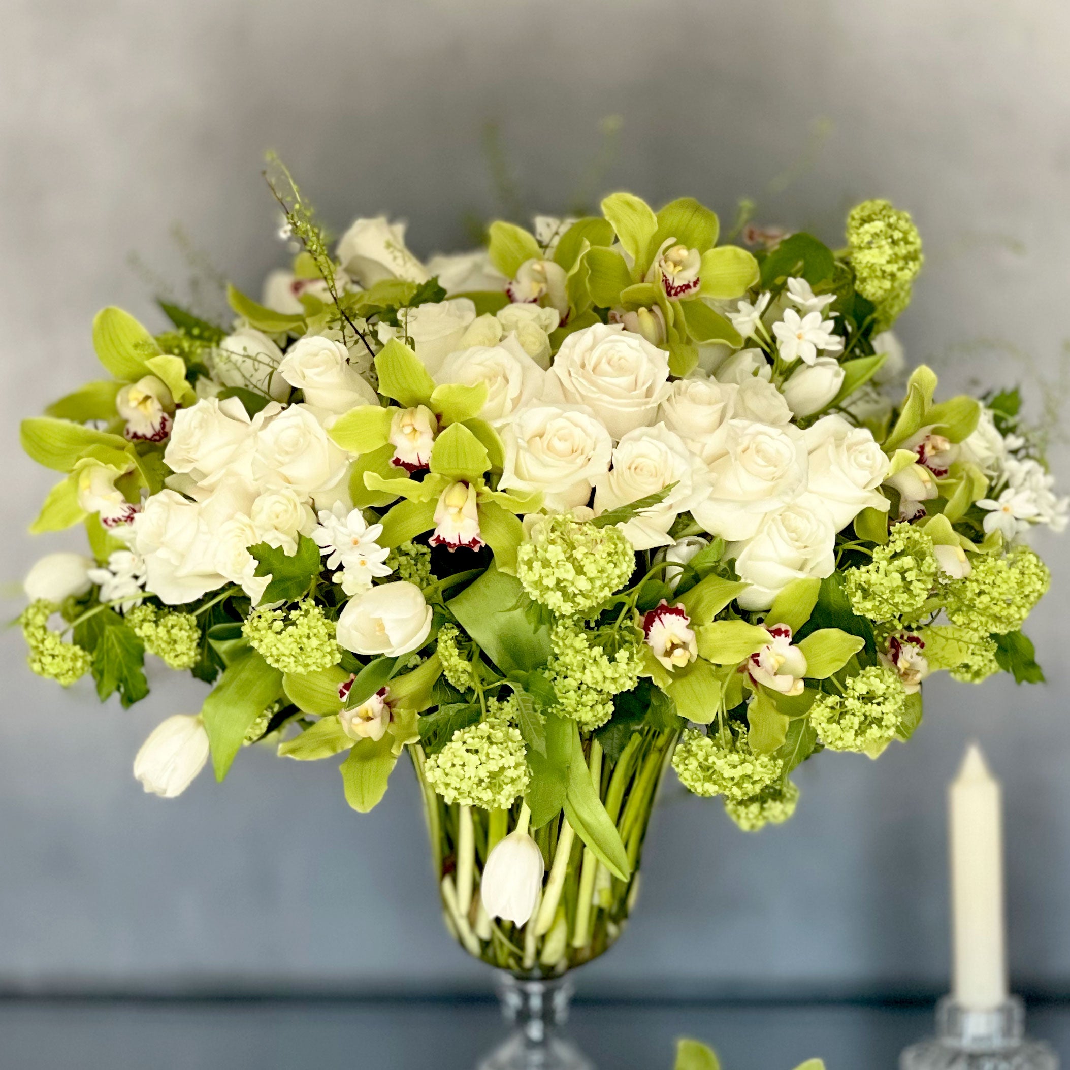 Delicate, charming, and always a favorite. Our Roman Holiday bouquet features a mix of white roses, tulips, vibernum and cym orchids and seasonal green floral in a glass pedestal vase.This arrangement has been picked fresh for you to help you celebrate a birthday, anniversary, or convey your message of love and sweet affection.