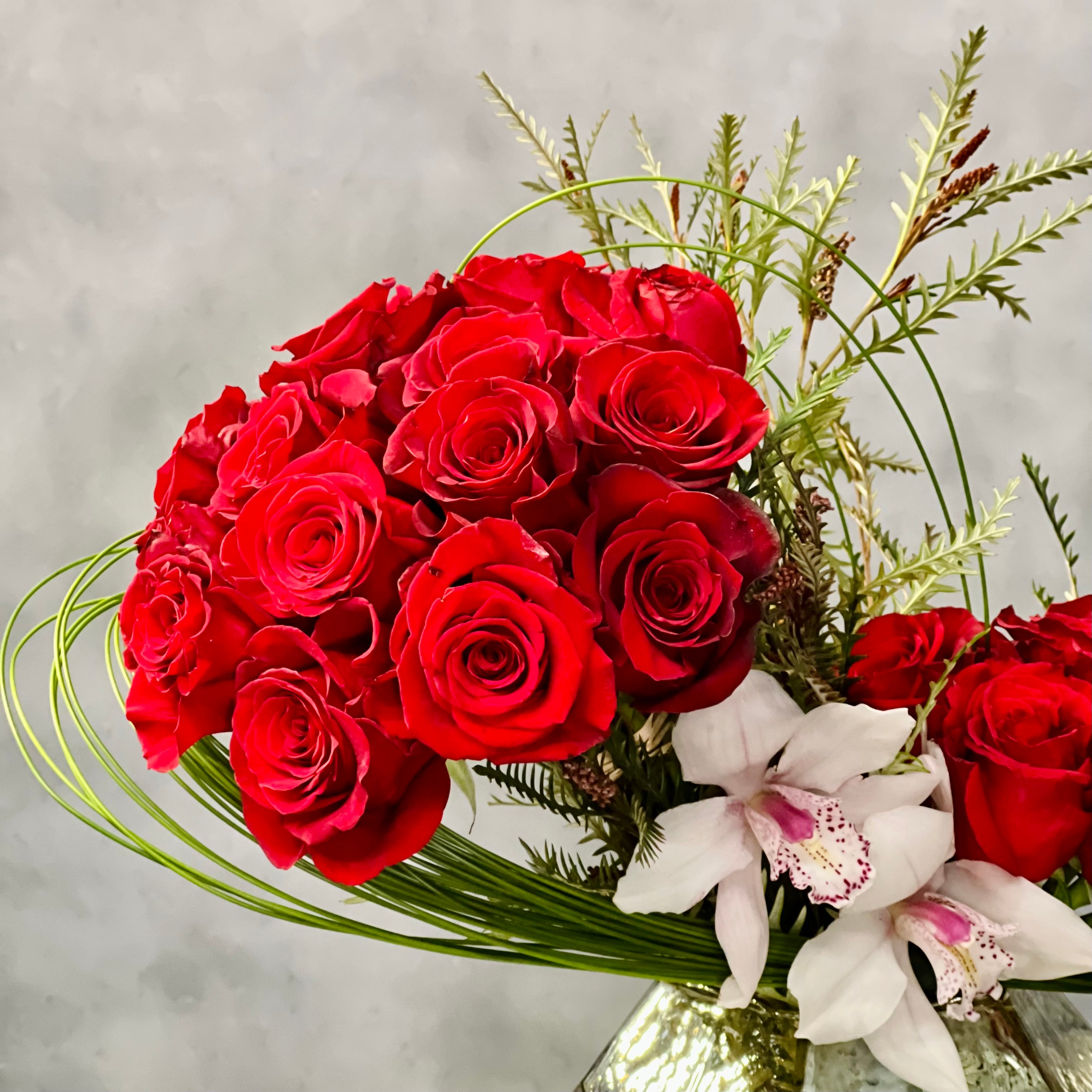 An opulent display of romance, “Rosalicious” features 50 fresh-cut, long-stem red roses arranged in a chic geometric vase with white Cymbidium orchids and lush seasonal greens. This vibrant floral piece is perfect for expressing love, making it ideal for “I Love You” and “Just Because” moments. Same-day delivery available in Beverly Hills.