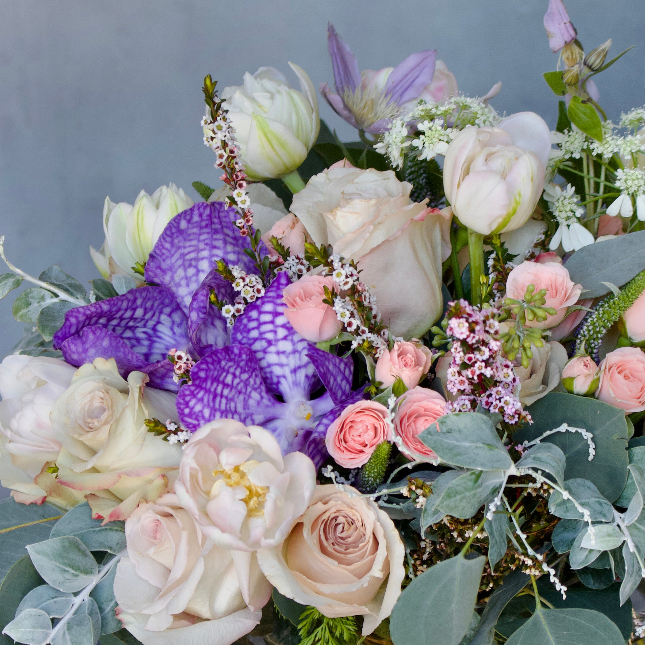 An absolutely charming way to send your warmest sentiments. Ivory, biege and light pink roses, white tulips , accented with purple vanda orchids in a glass bowl. This is an arrangement that will delight your special recipient at every turn. Perfect for occasions like birthdays, just because, thank you and just thinking of you.