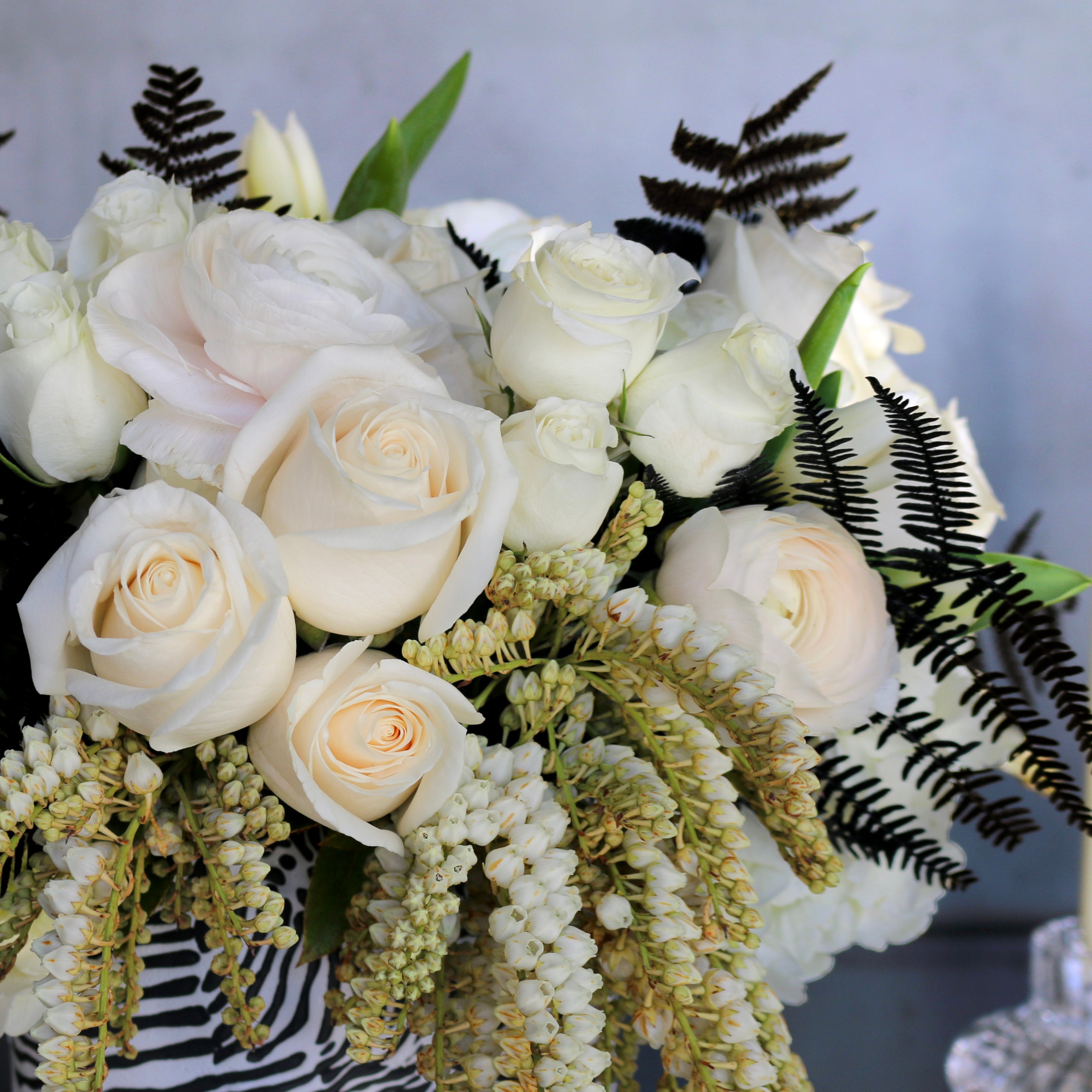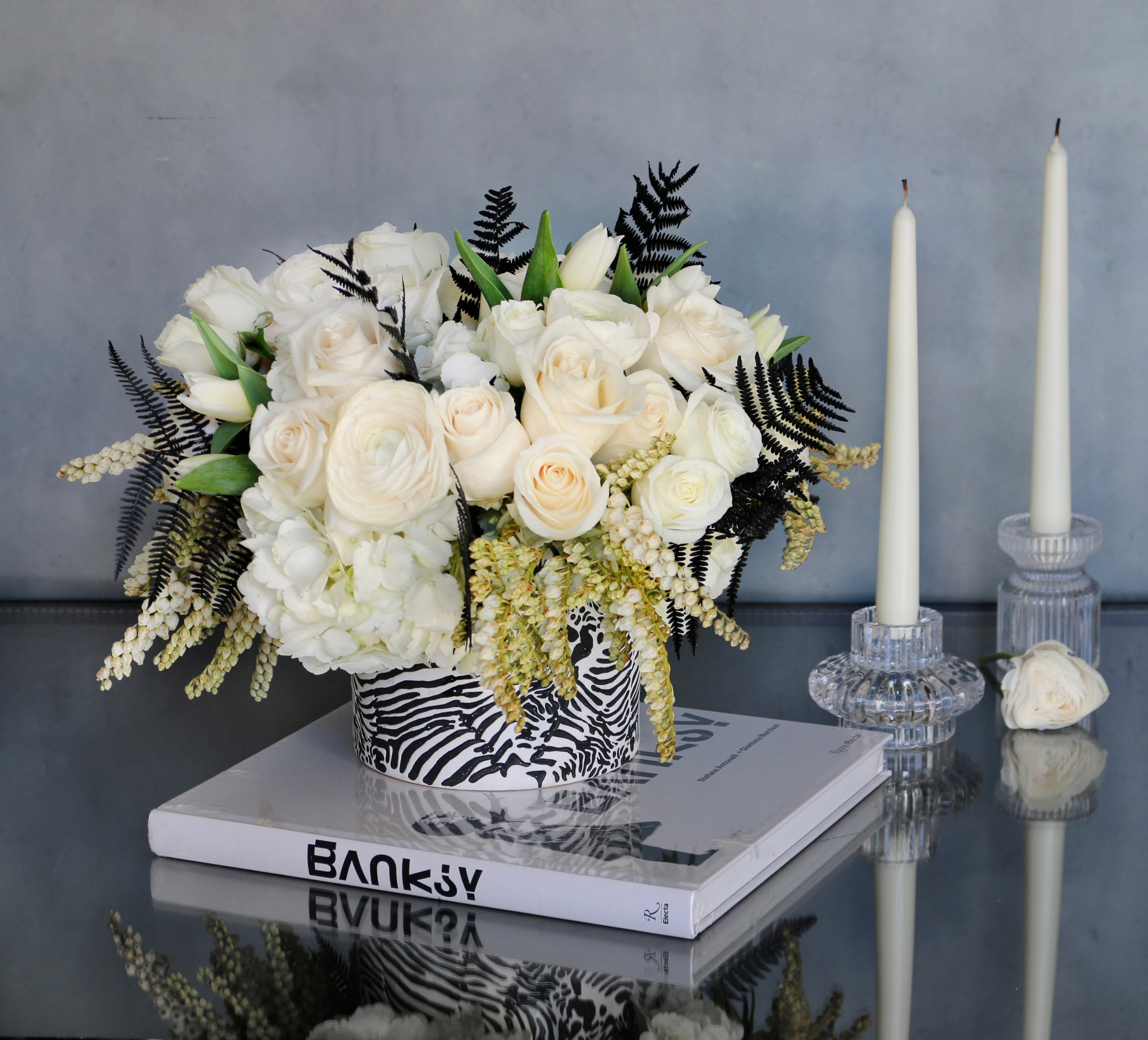 A chic twist to a classic black & white arrangement ! Our “safari” is ready for any occasion ! An array of White Roses, Lilacs, Ranunculus, and various dry elements and greens. All placed within a white and black vase.