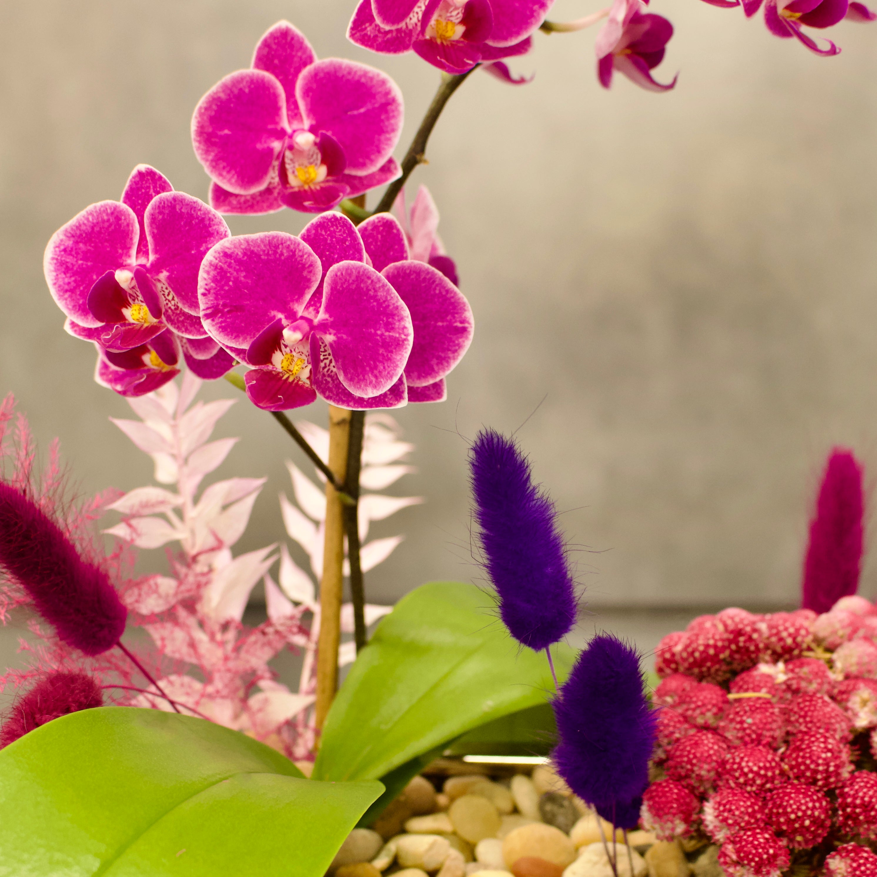 This unique, modern design offers a bold new take on the traditional plant. A unique touch to the perfect centerpiece. Cascading Orchid with Accents of colorful dry elements.