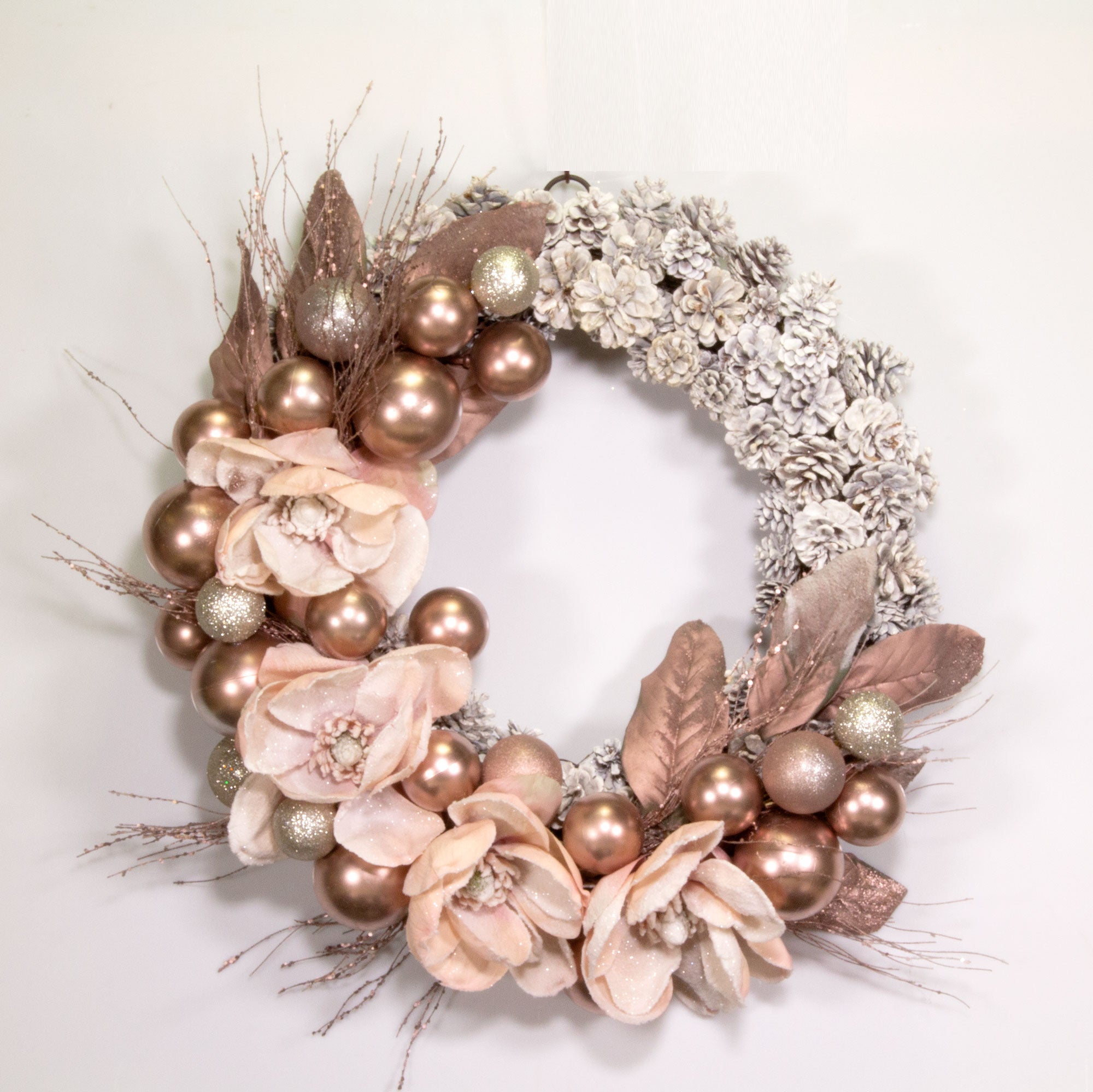 Bring a touch of unexpected color to your holiday décor with our Santa’s Blushing wreath. Warmly welcome guests into your home with this decorative mix of frosted pinecones, flowers and glistening ornaments.