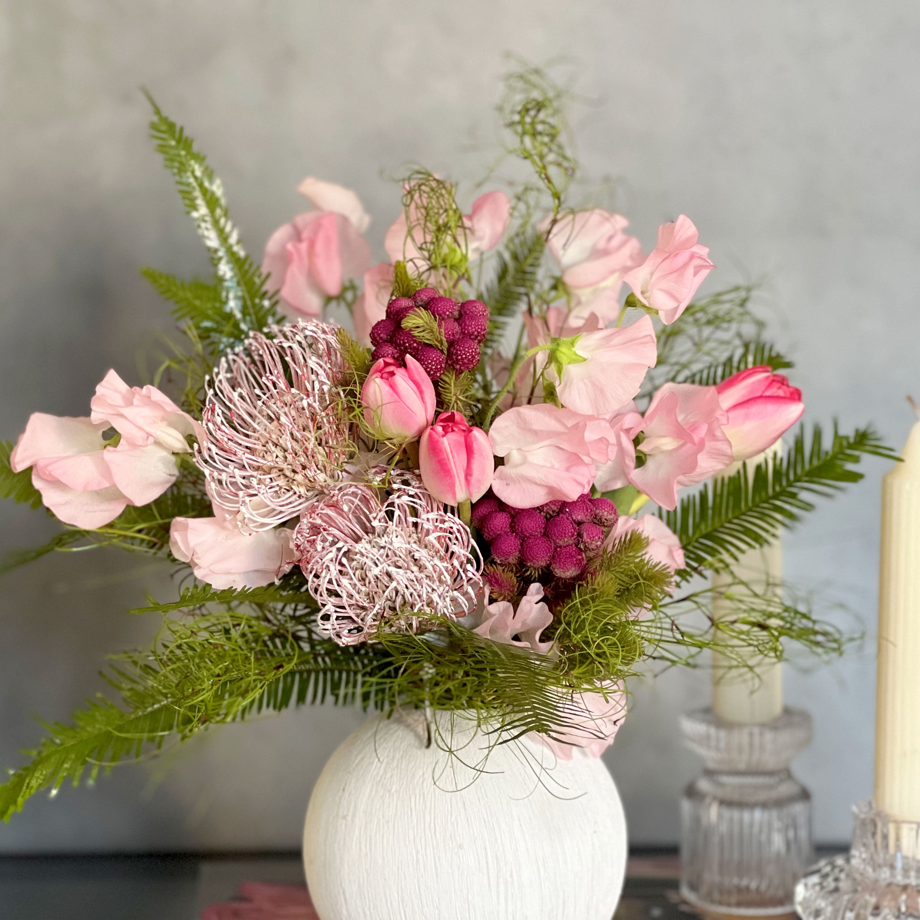 Our Shades of Pink arrangement is gathering of blooms in shades of pink, rich in beauty and sentiment. It features Sweet Peas, tulips, protea and seasonal greens. It’s a stunning gift to send when you want to say, “Everything is better because of you.”