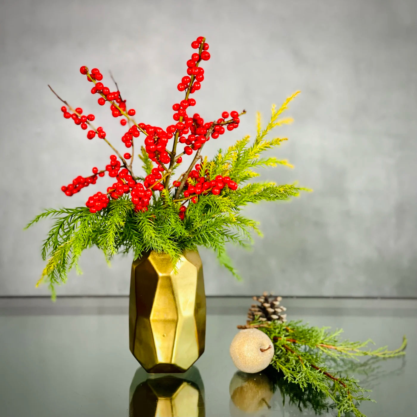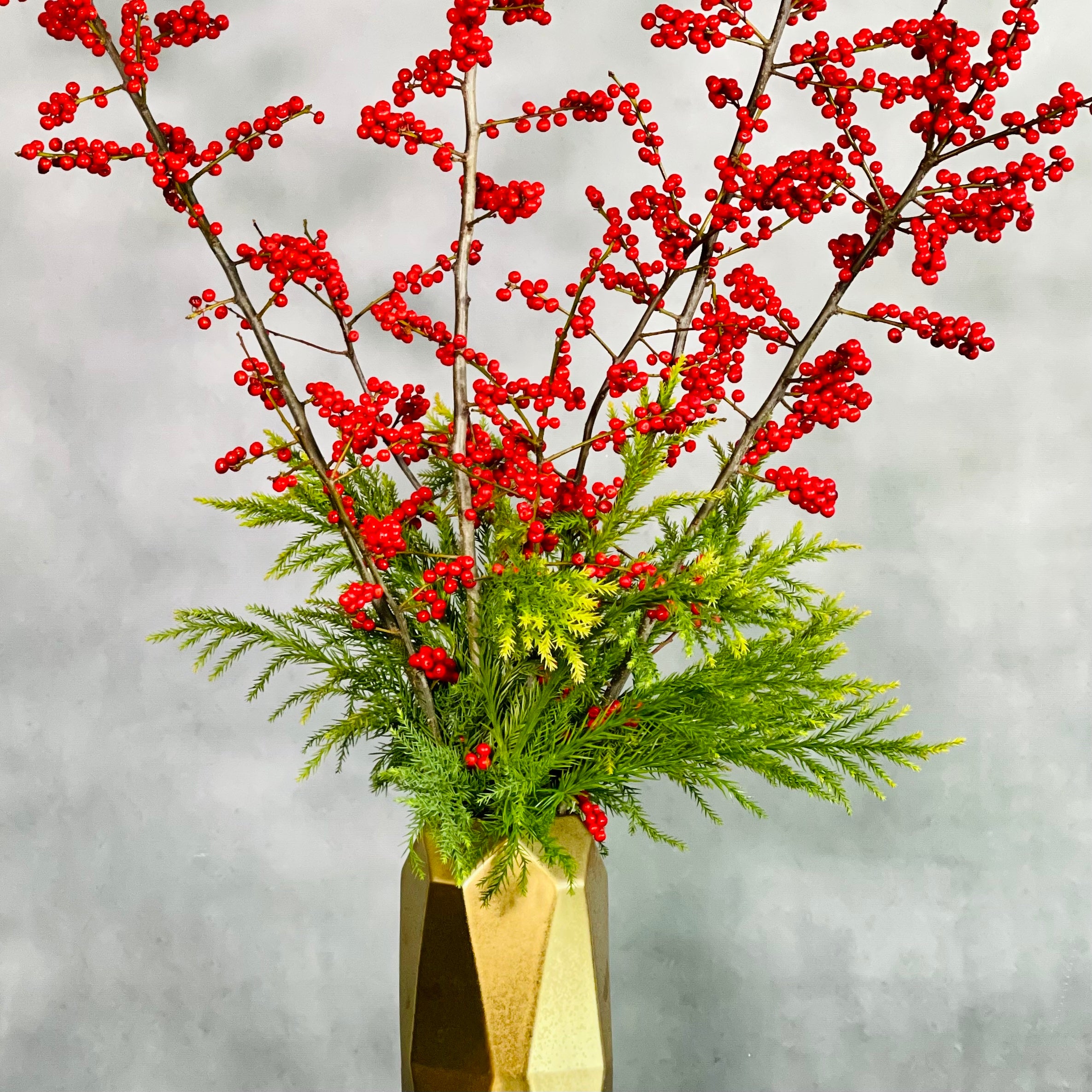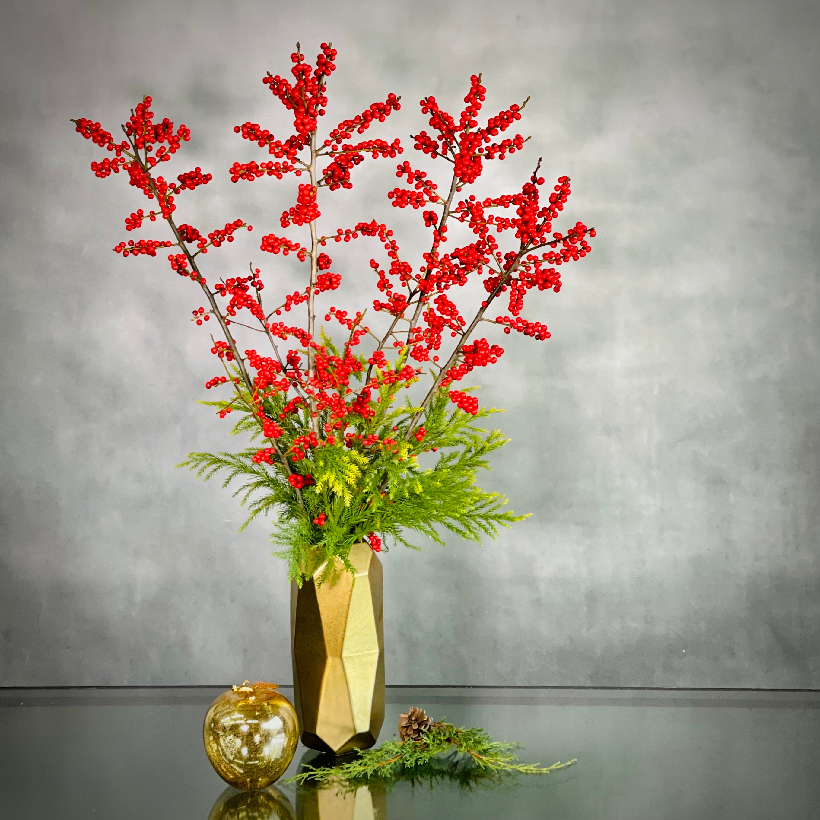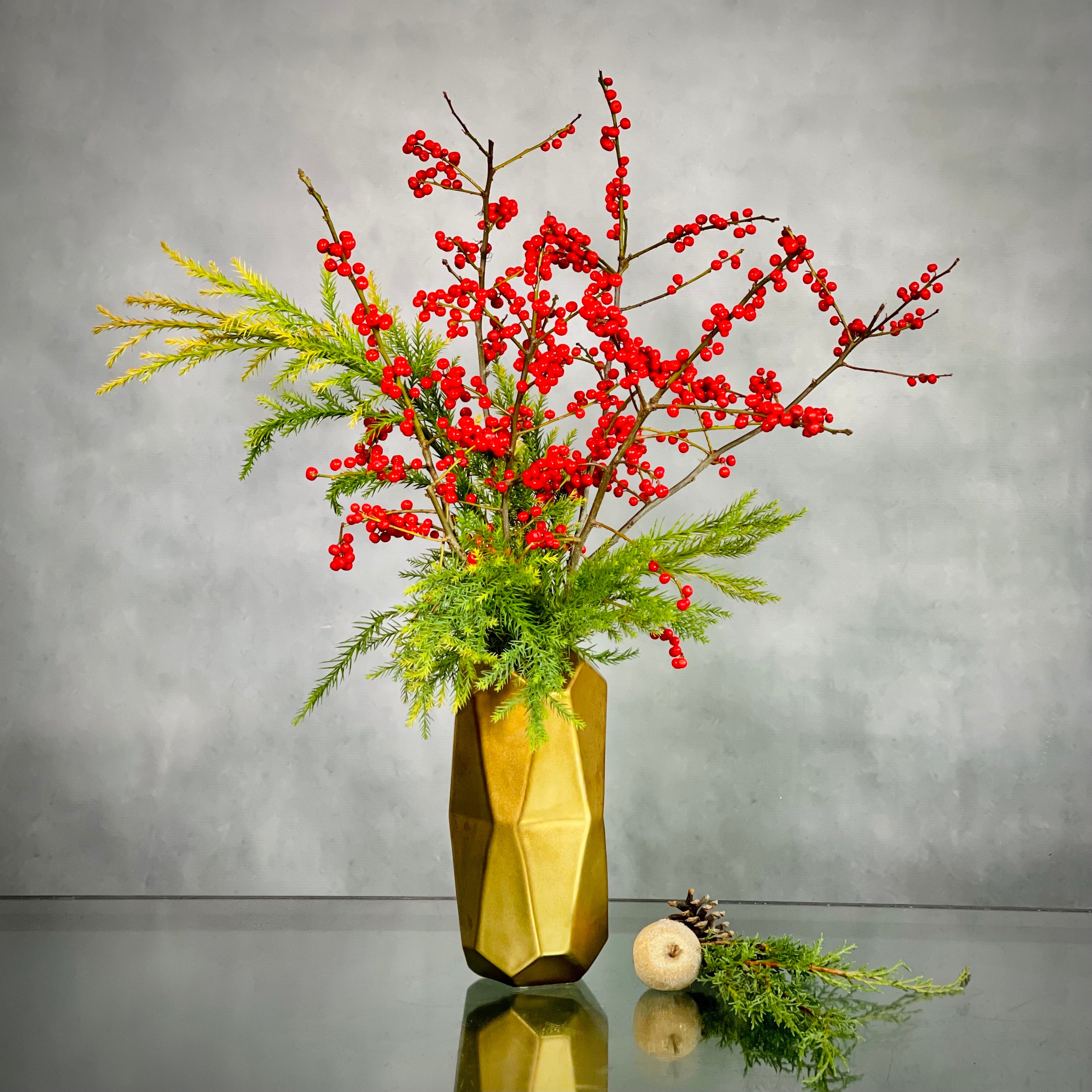 Ilex branches in a geometric vase for a simple and modern look.