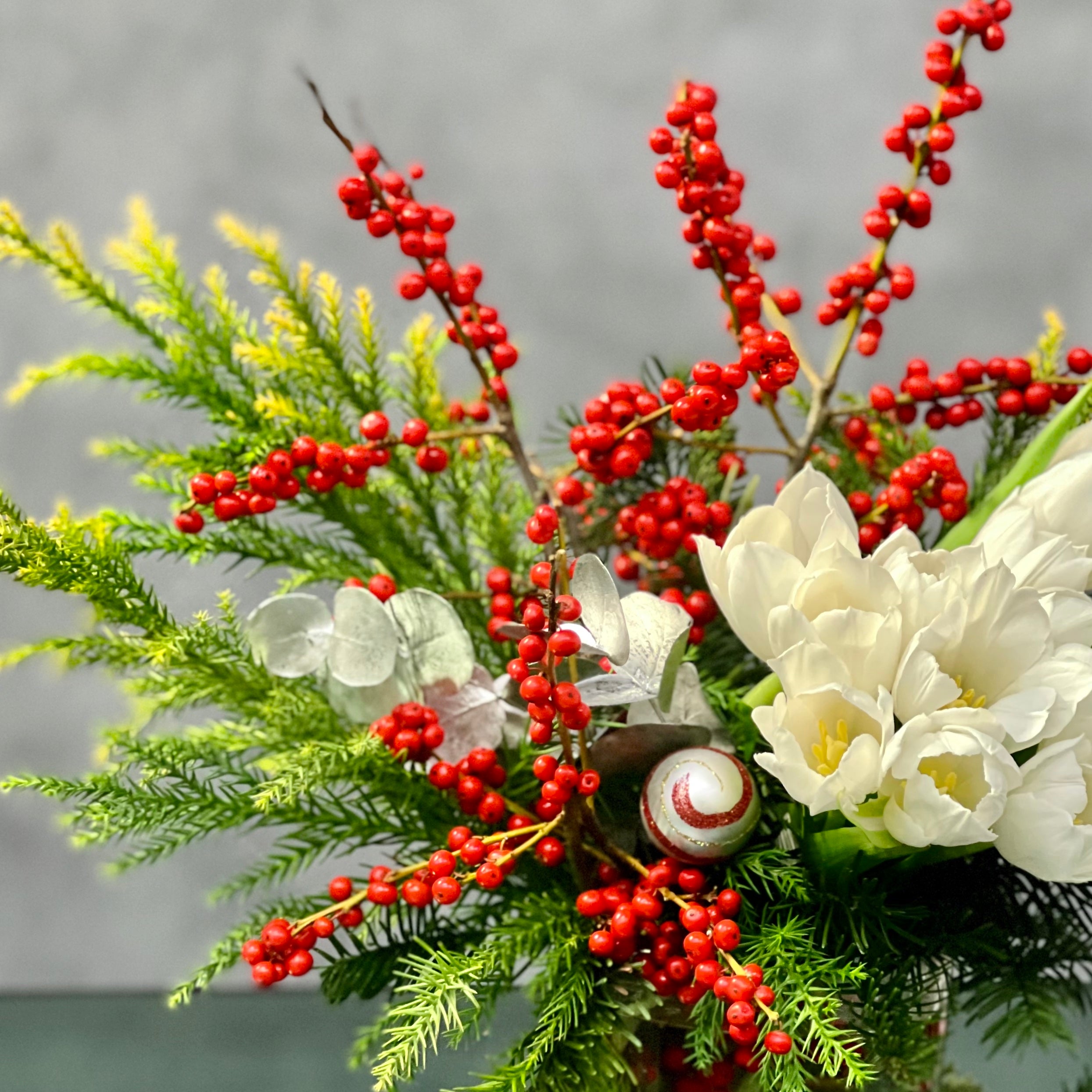 Holiday Greens, tulips and Ilex put together in a 5X5 Glass Vase. simple and Chic for any Holiday gift. .