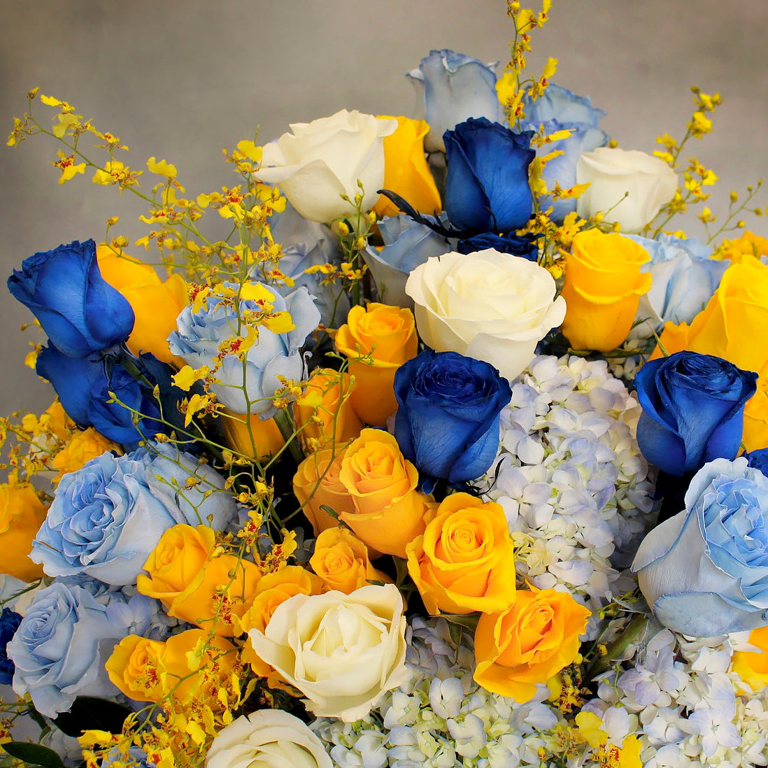 This large summer nights arrangement consists of shades of blue, yellow, and white roses nested on light blue hydrangeas and yellow orchids the vase is 10×10 inches