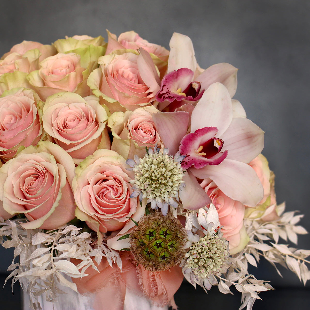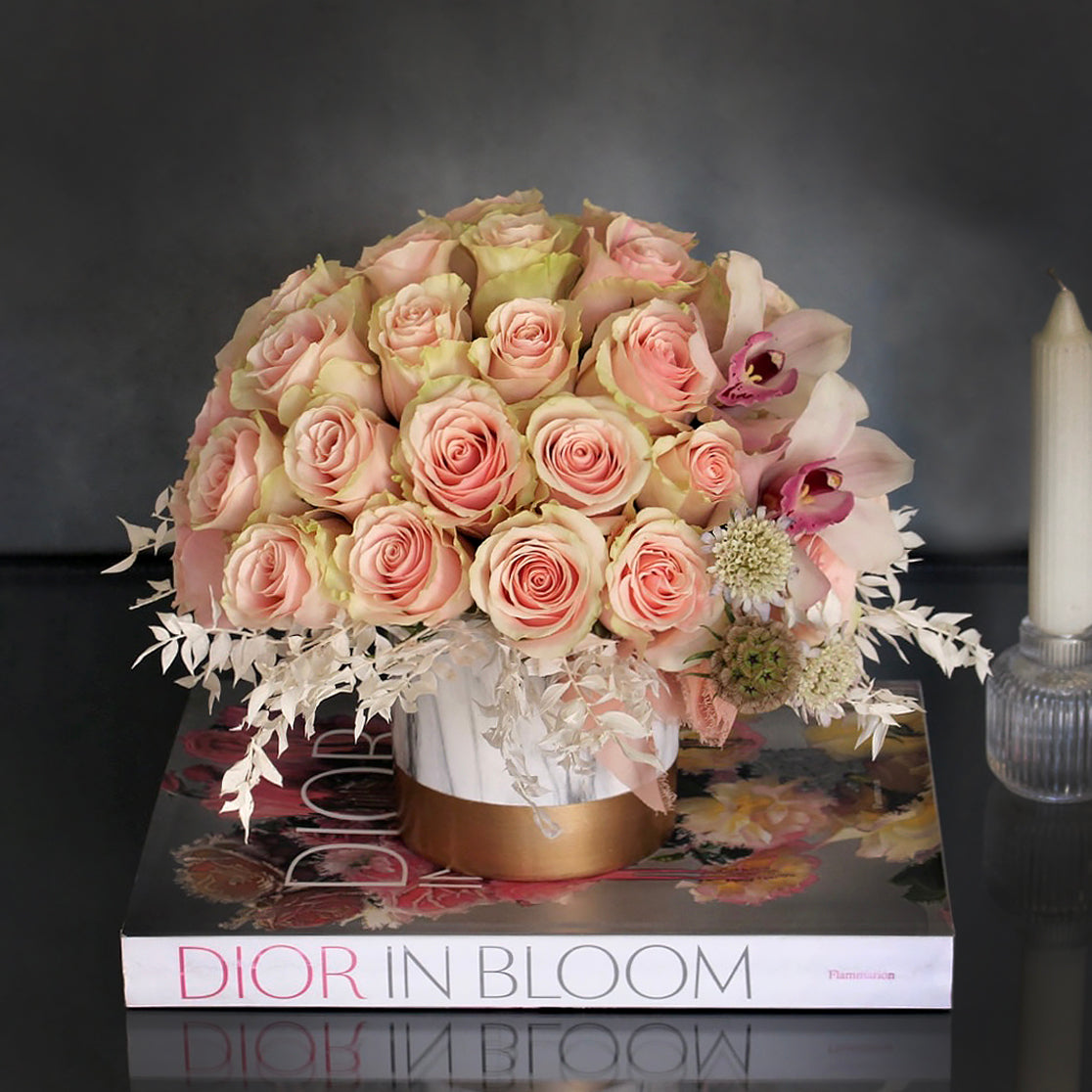 Summer Pinks of 24 pink roses and cymbidium orchids and dry elements nested in a marble like vase.