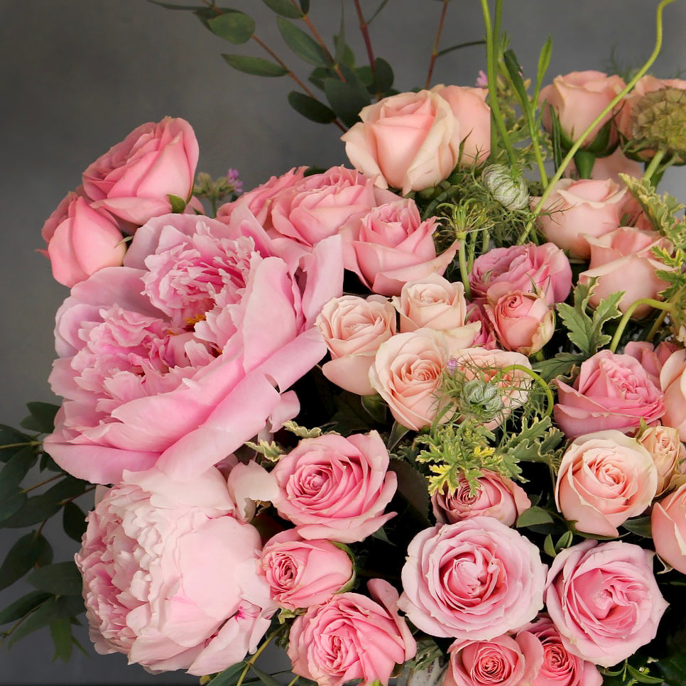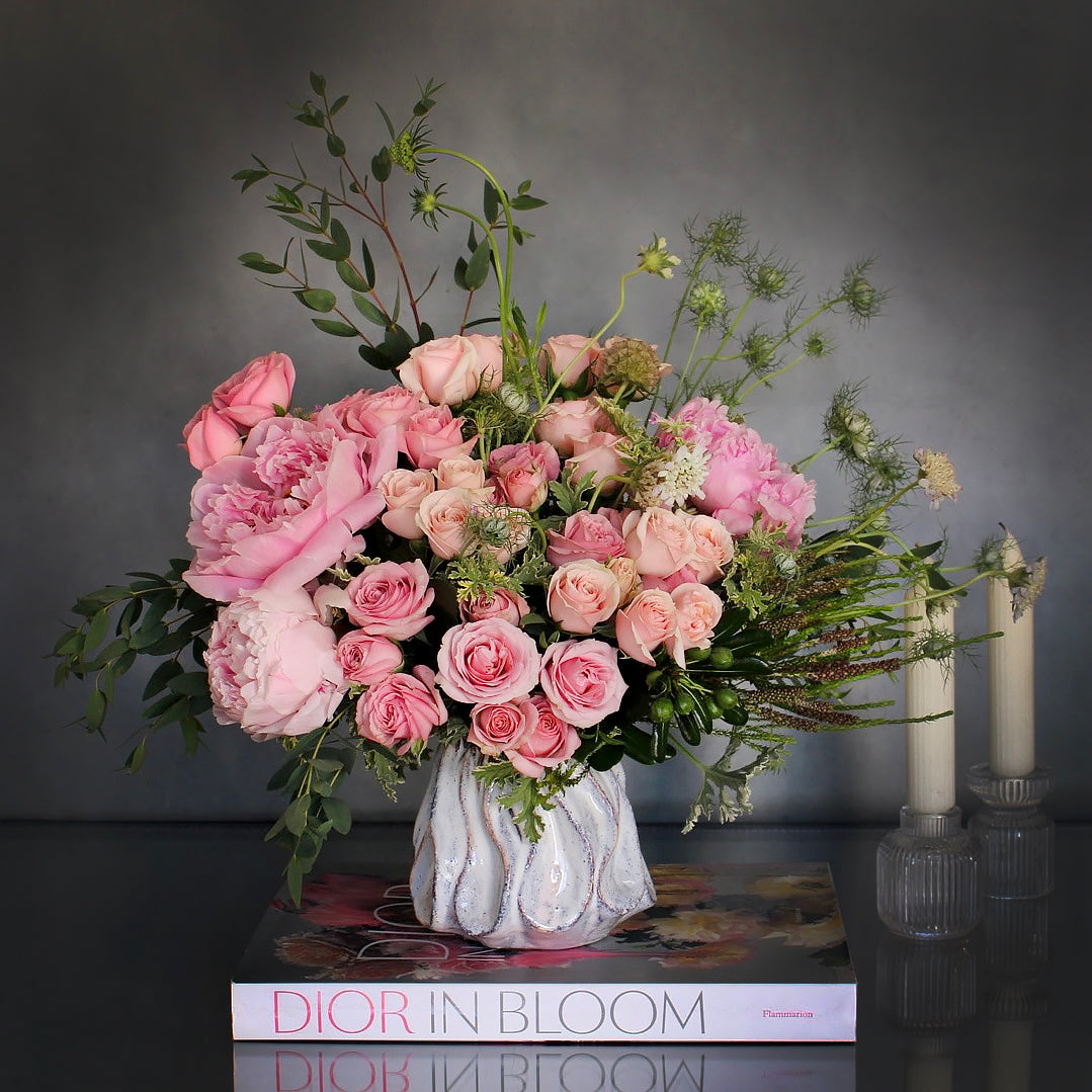Our “summertime gem” is just in time for the season! Arranged with various pink and wonderful pink Spray Roses and Peonies. A classic made beautifully inside a eccentric ceramic vase.
