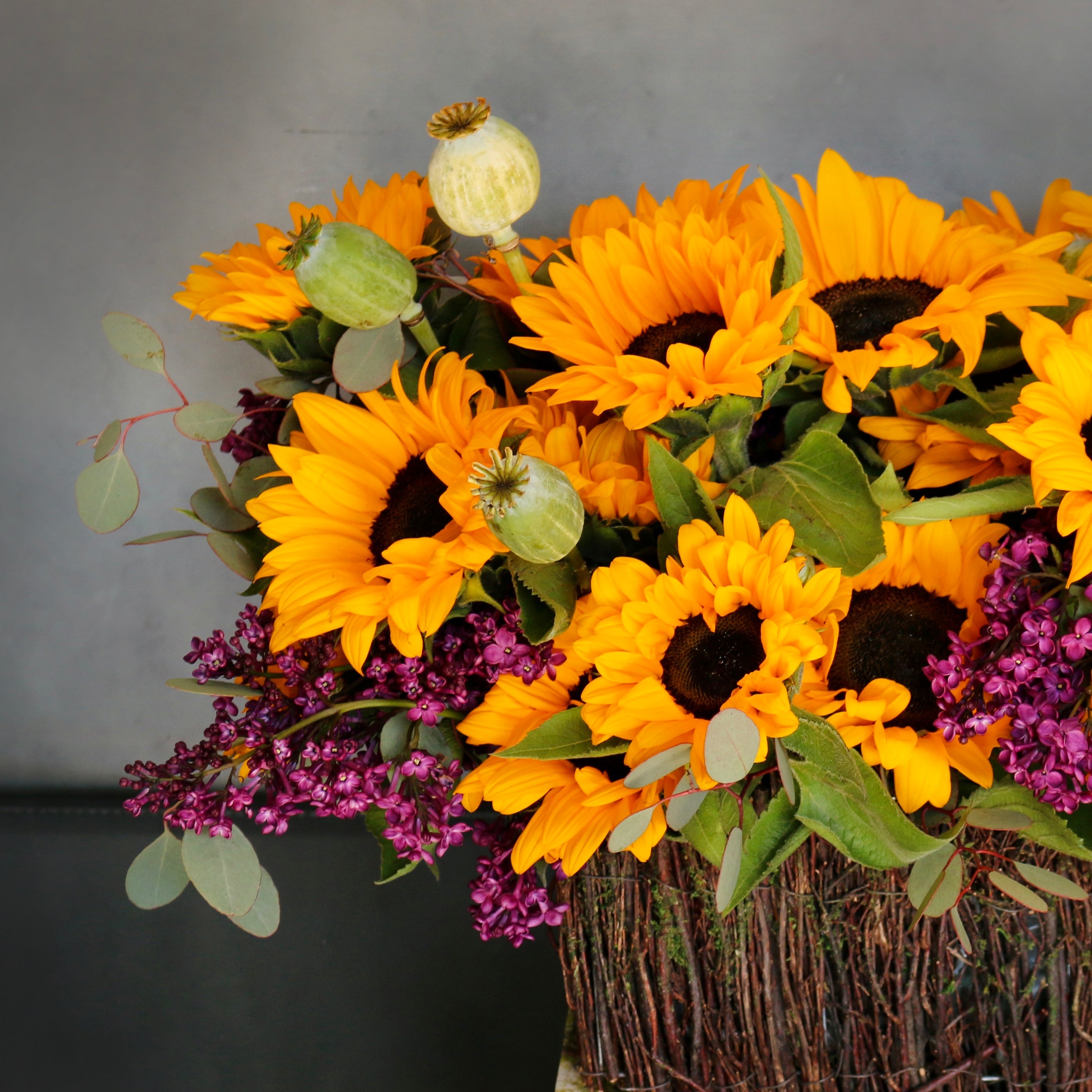This arrangement combines the bold beauty of sunflowers with the delicate allure of lilacs, creating a harmonious blend of colors and textures that will captivate the senses. Each bloom is carefully selected and artfully arranged to showcase its natural beauty, ensuring a stunning centerpiece that will brighten any space.