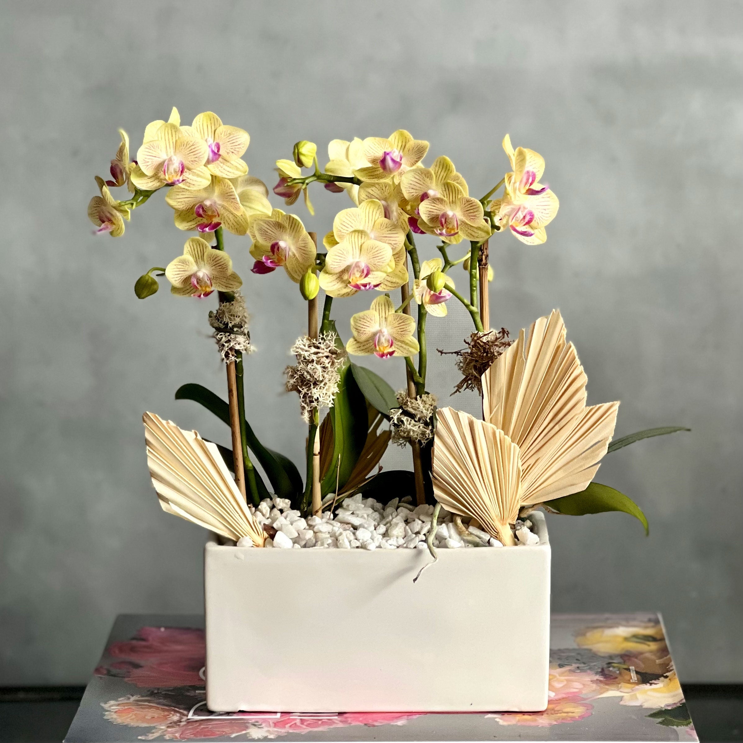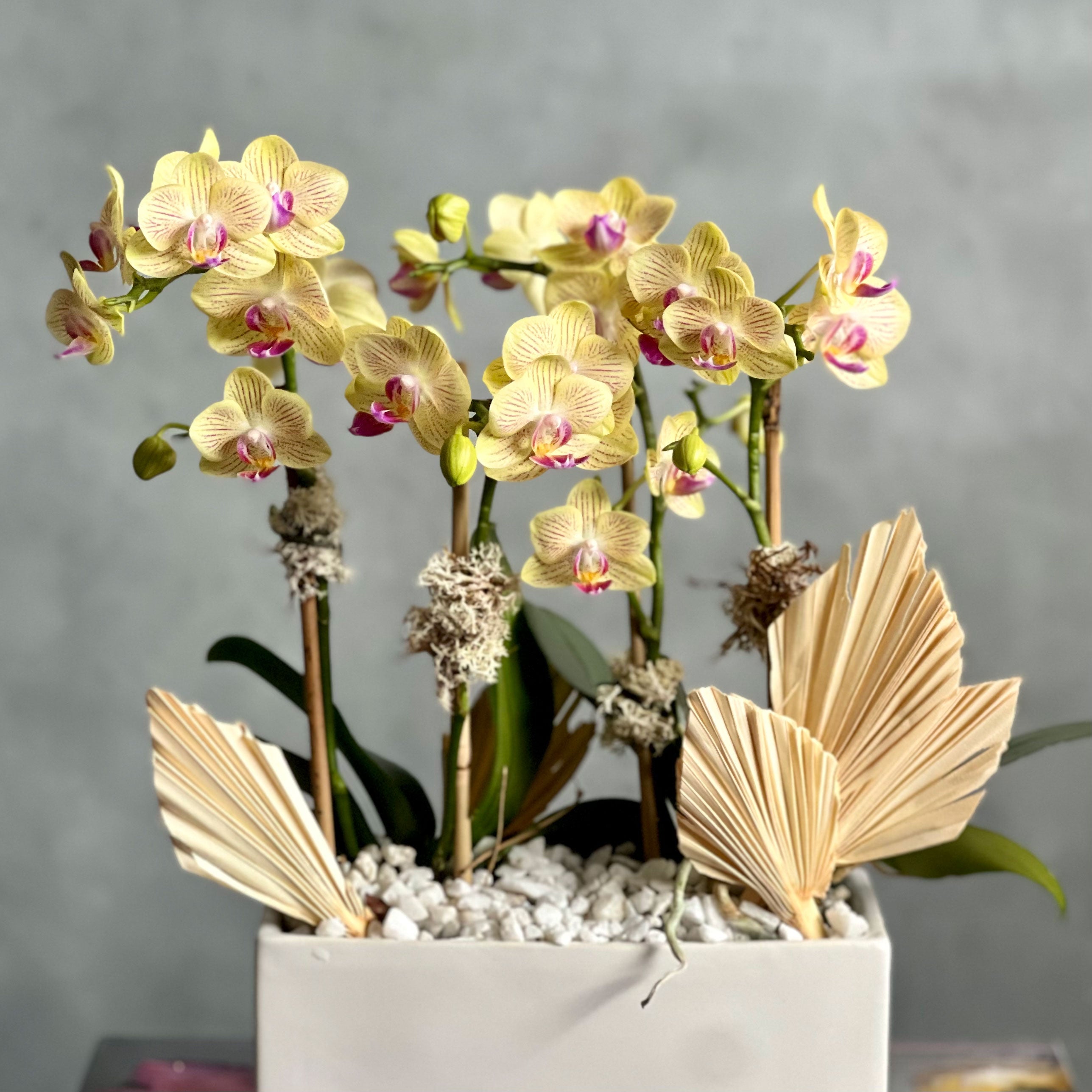 Our new addition to our potted orchids are ready to bring in a pop of color! Our “Mini Sunshine” is made with 4 single stem mini orchids in a yellow/green shade. Placed within a short white vase and accented with white stones and dry elements.