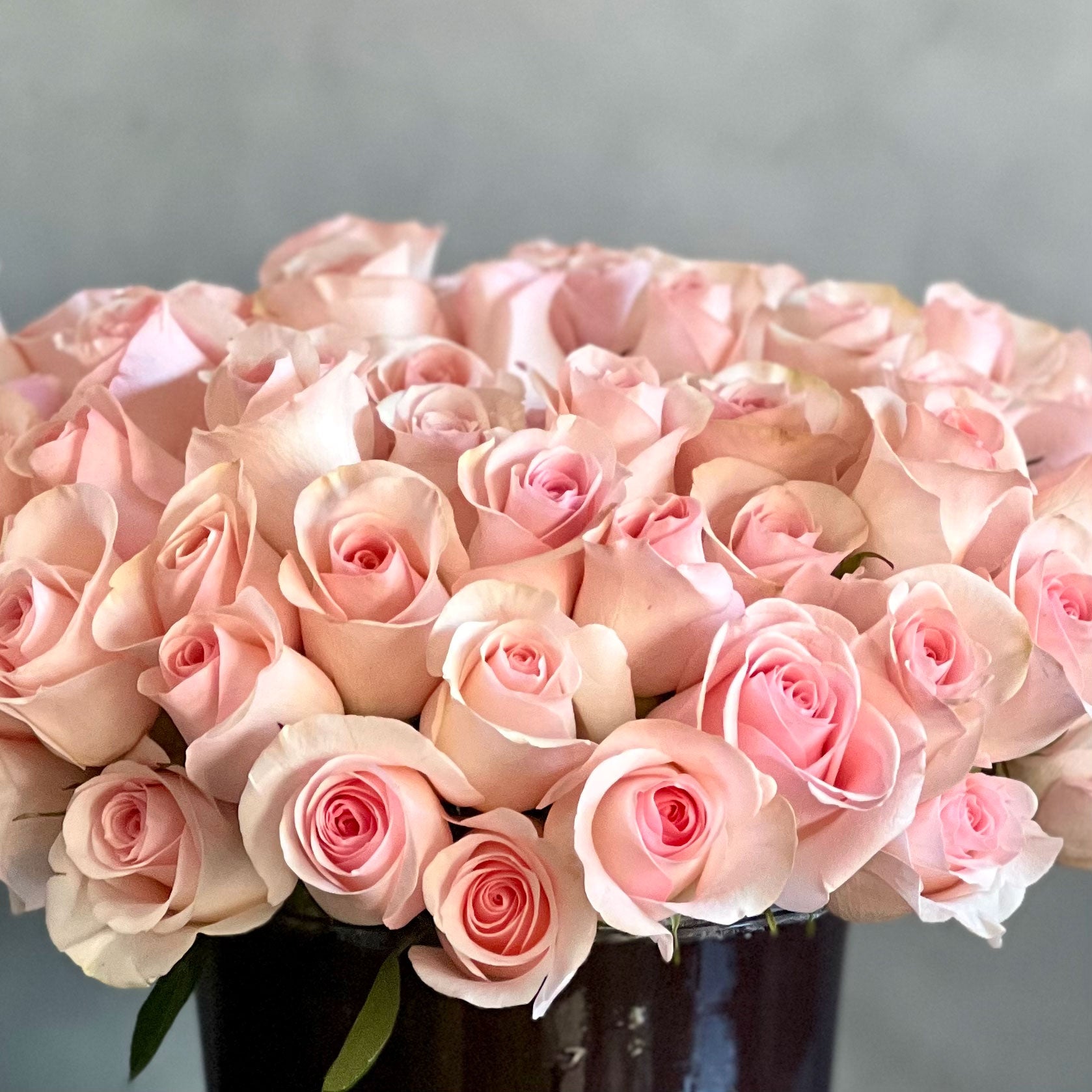 About 100 south American sweet Roses gathered in a Leaf lined Glass Vase. Simple and elegant.