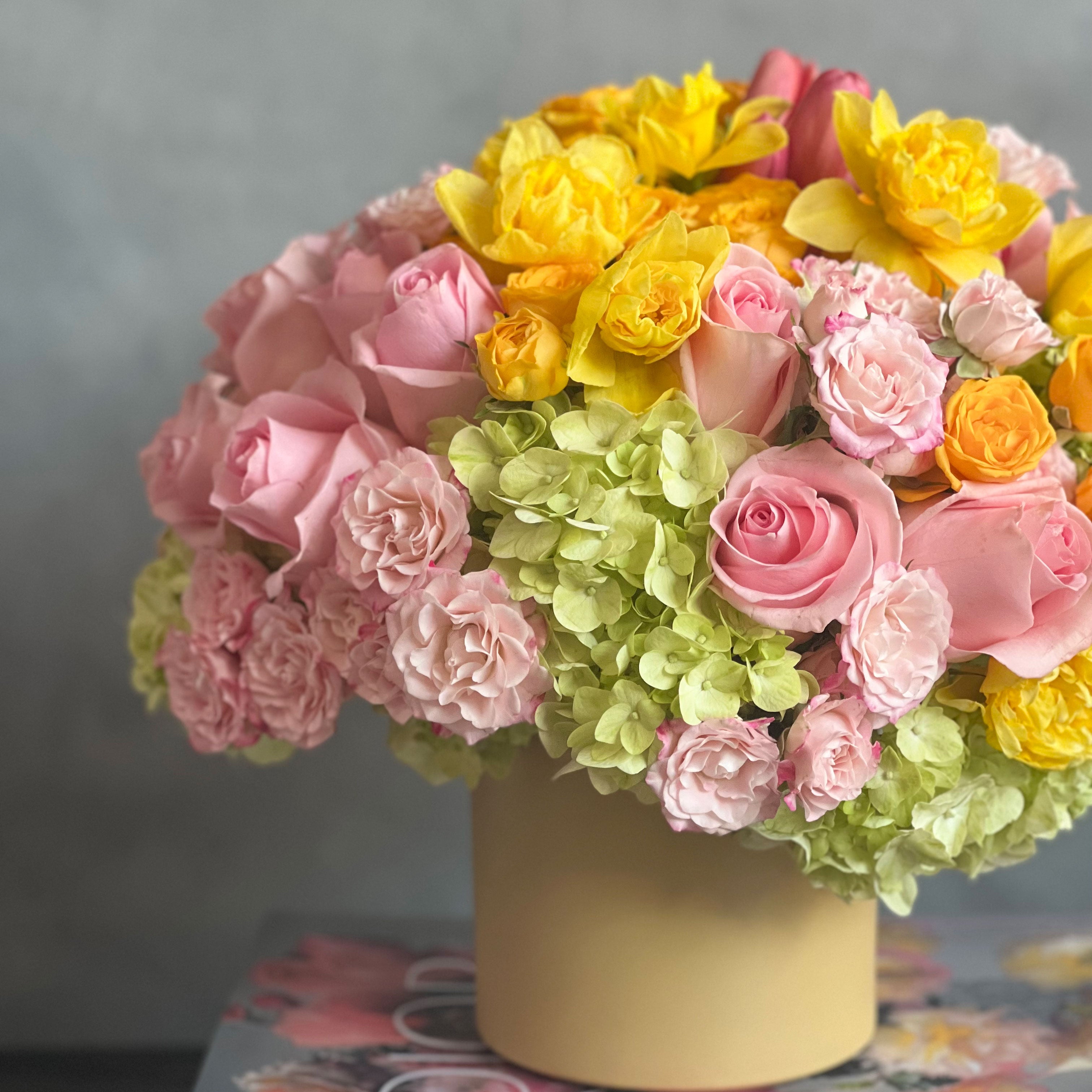 This beautiful arrangement is perfect for spring and easter. It will brighten every corner of the room. Pink roses, pink spray roses, pink tulips and pop of yellow daffodils, and yellow spray roses all nested in light green hydrangeas on a pale yellow vase.