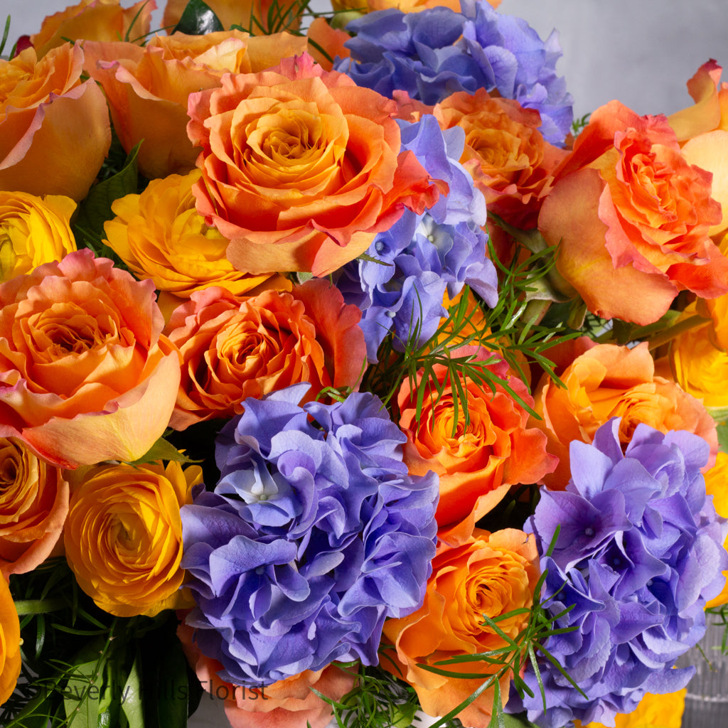 Same Day Delivery – flower bouquets hydrangeas. Immerse yourself in the warmth of a summer sunrise with our spectacular arrangement featuring over 50 tangerine-colored garden roses and vibrant yellow ranunculus, and Blue Hydrangeas. Nestled in an elegant white 8″ square vase, this stunning display measures an impressive 15″ in diameter, radiating joy and vitality in every direction. Each bloom is meticulously arranged to create a harmonious composition that captures the essence of a sunburst in full bloom. Whether adorning your home or brightening a special occasion, let this radiant arrangement bring a touch of sunshine into your life.