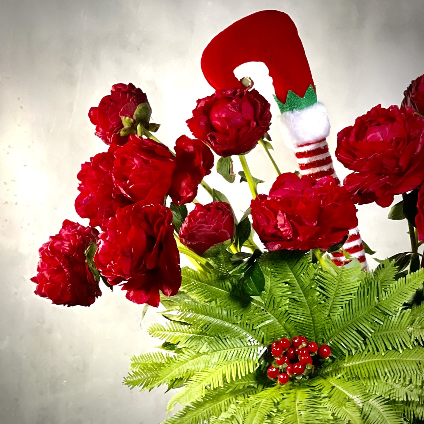 A few tipsy turns into the holiday spirit. This piece will bring holiday cheer with jollification to the center of your table. Making it a great centerpiece for your event. This arrangement includes a beautiful array of 16 deep red peonies, Umbrella Fern and red coffee beans.