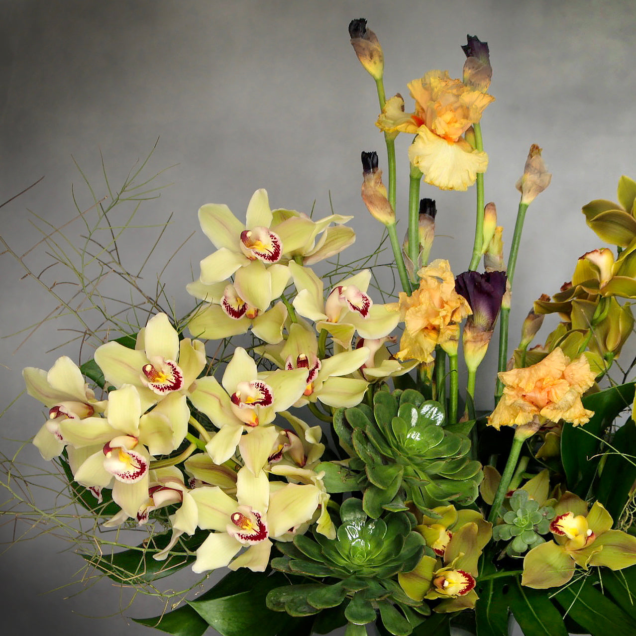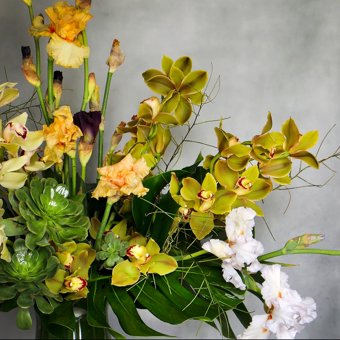 Lovely fresh-cut pale yellow and green cymbidium orchids paired with succulents and bearded iris stands tall as it proudly flaunts it’s color. A wide Monstera leaf adds an abstract frame to draw attention and the stunning floral design they create together. These green flowers symbolize life and are great for any occasion of new beginnings or renewal. Approx: 36″ H x 14″ W