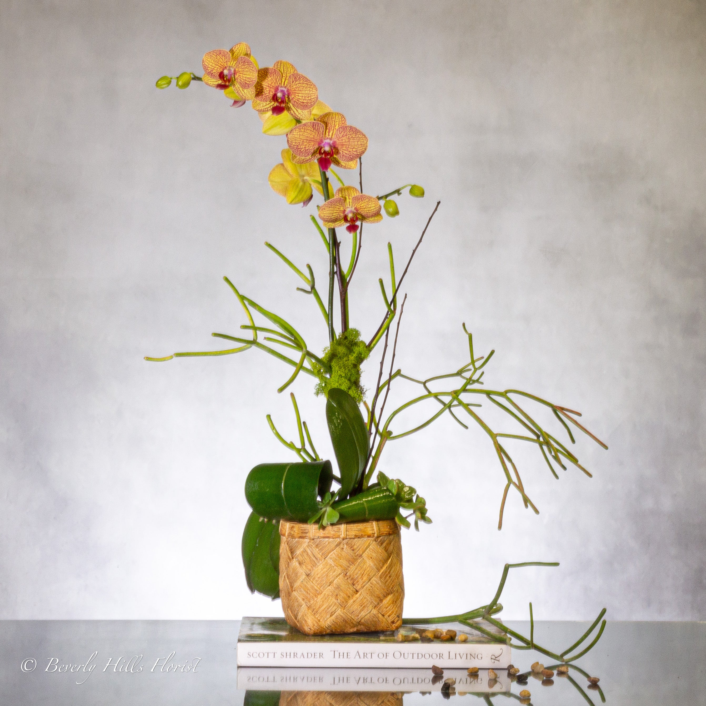 Our stunning yellow Orchids with hints of red, paired with mini succulents, are elegantly displayed in a timeless basket weave design. The handcrafted basketweave ceramic vase adds a touch of luxury and can be delivered on the same day. Lush moss and greens at the base enhance the overall delicate aesthetic of this exquisite design, standing at approximately 26 inches tall.
