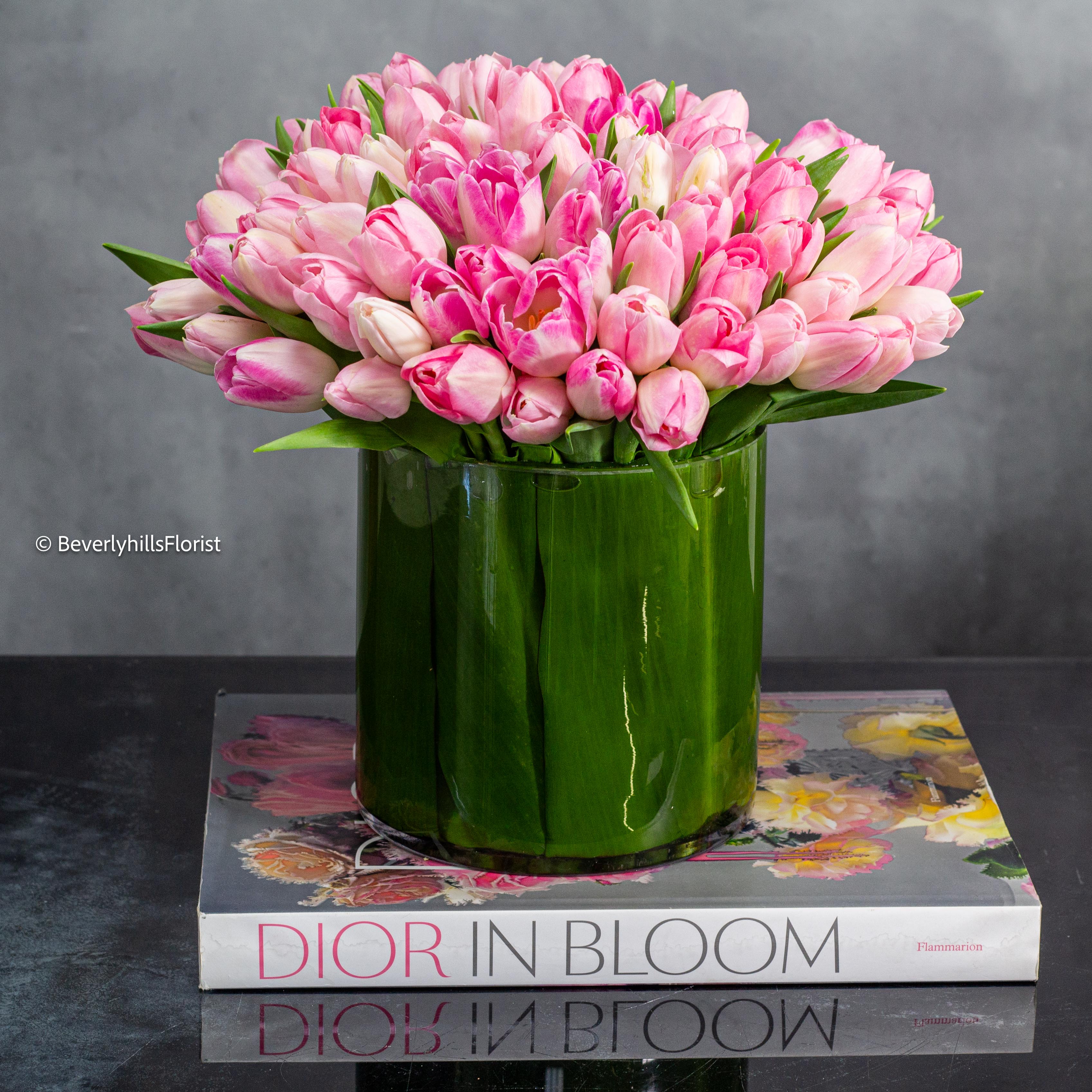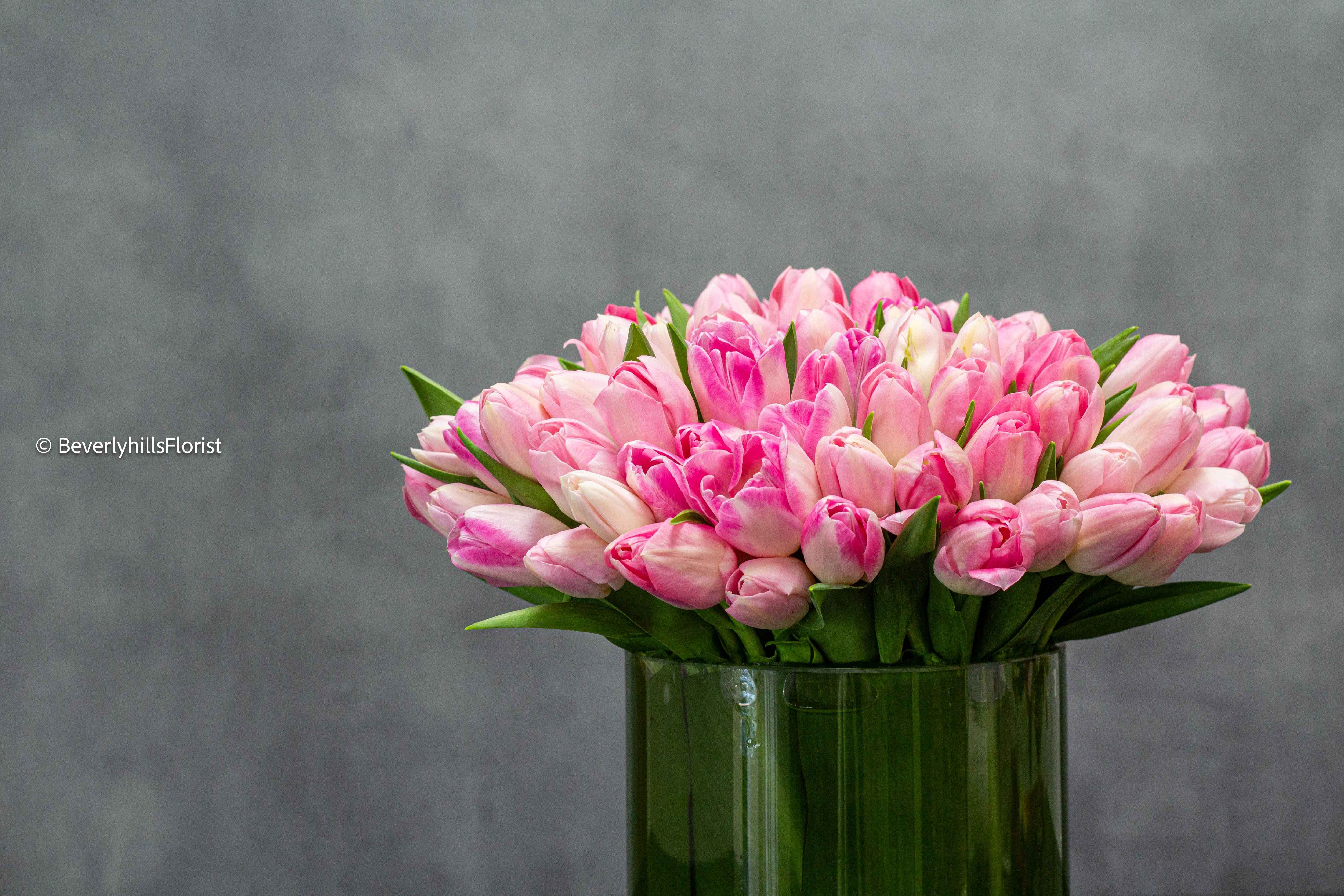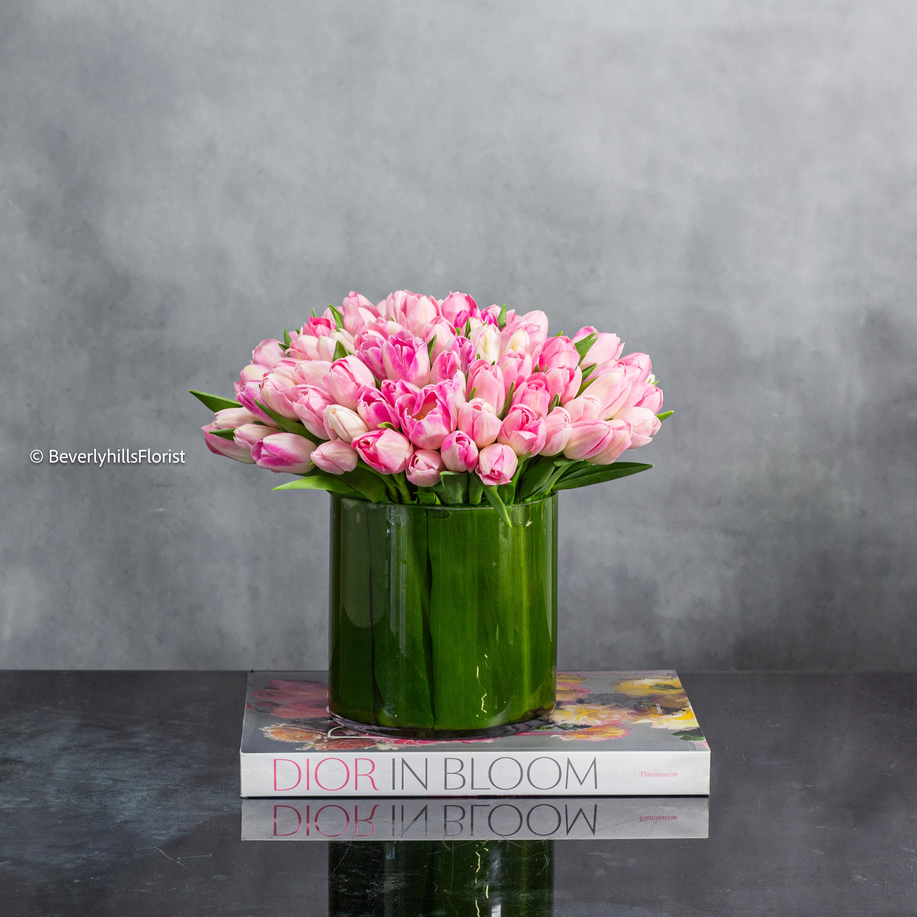 In a clear cylinder glass vase, a simple yet enchanting display unfolds. Each tulip, dipped in delicate hues of pink, emerges gracefully amidst a bed of lush tea leaves. This elegant arrangement captivates with its understated beauty, evoking the gentle serenity of a spring morning.
