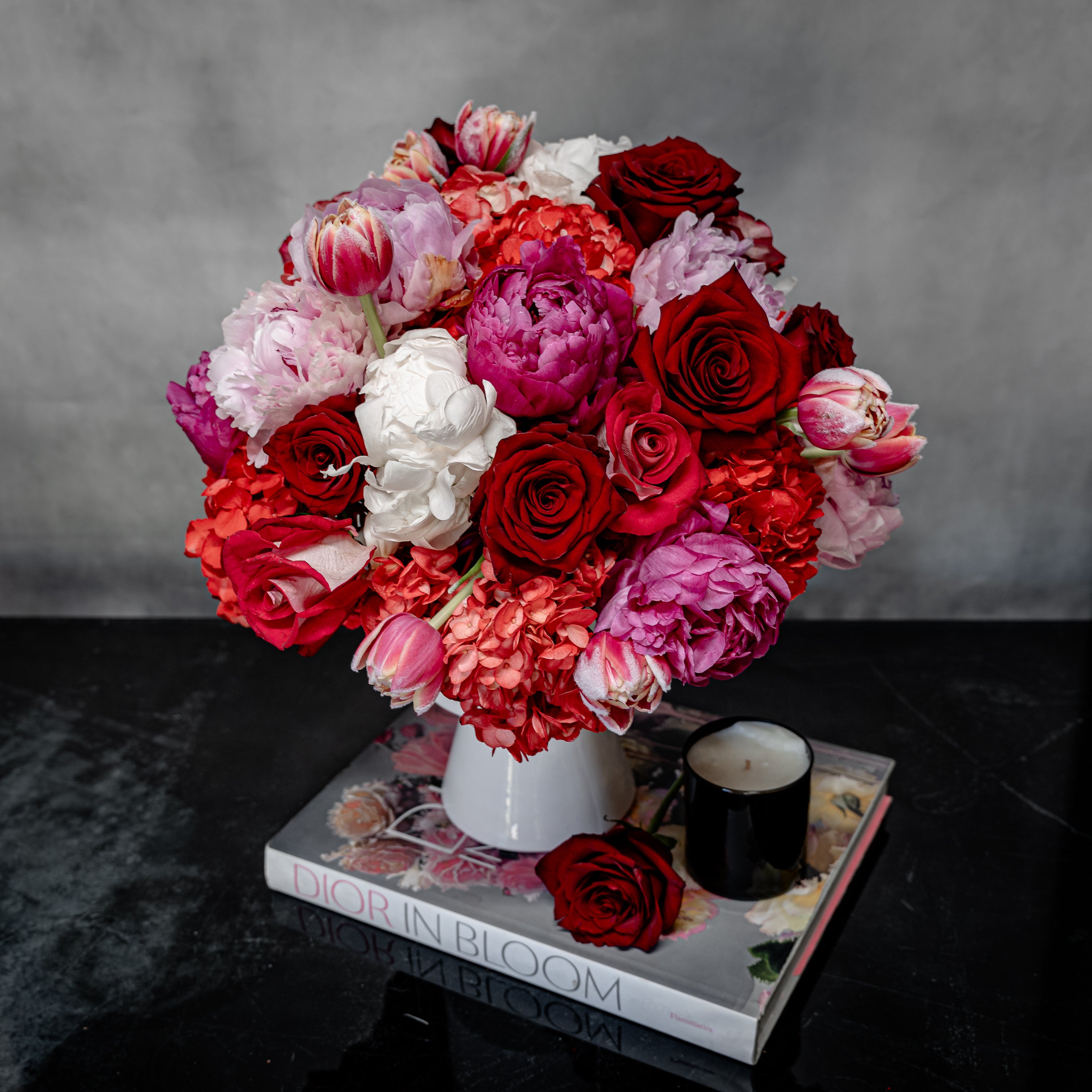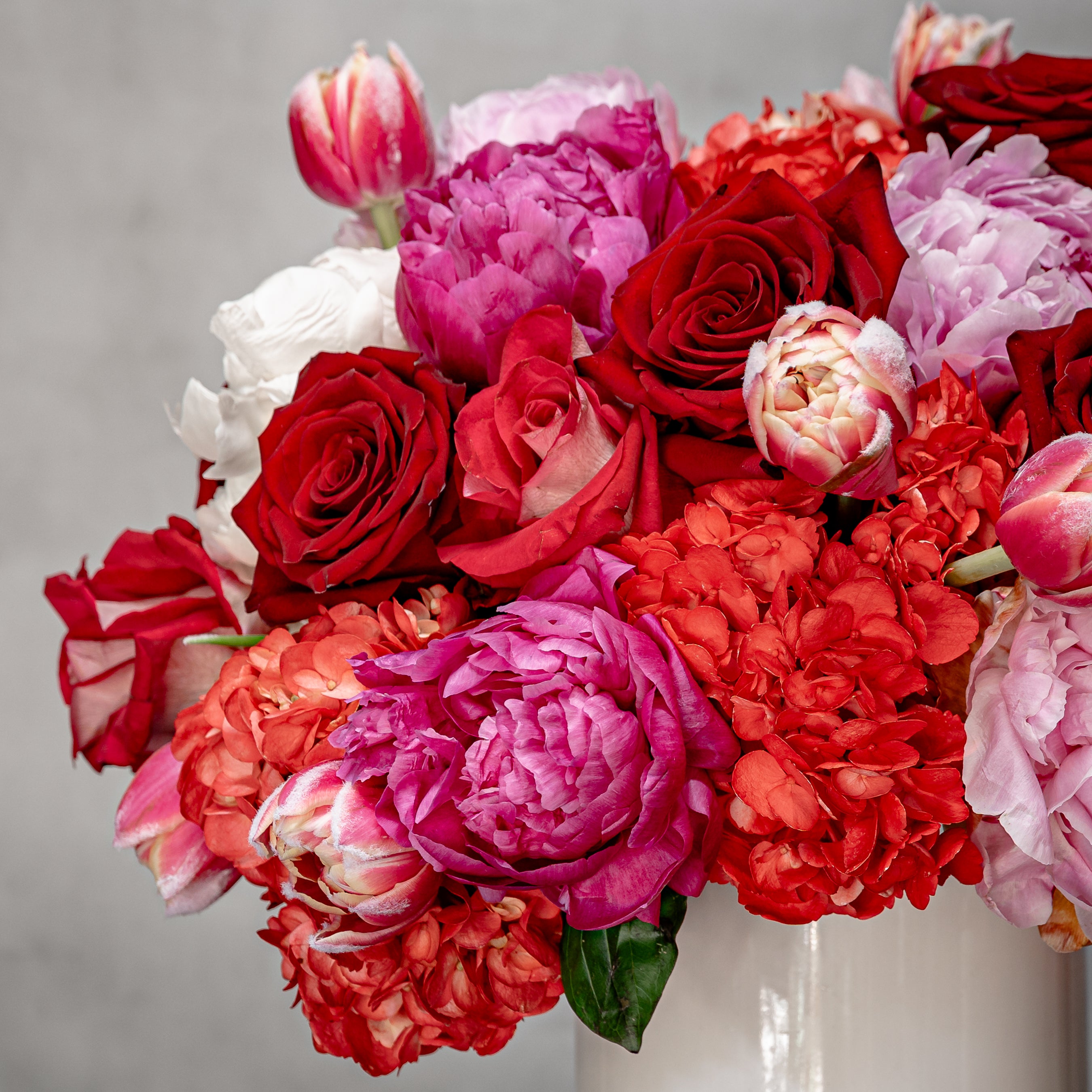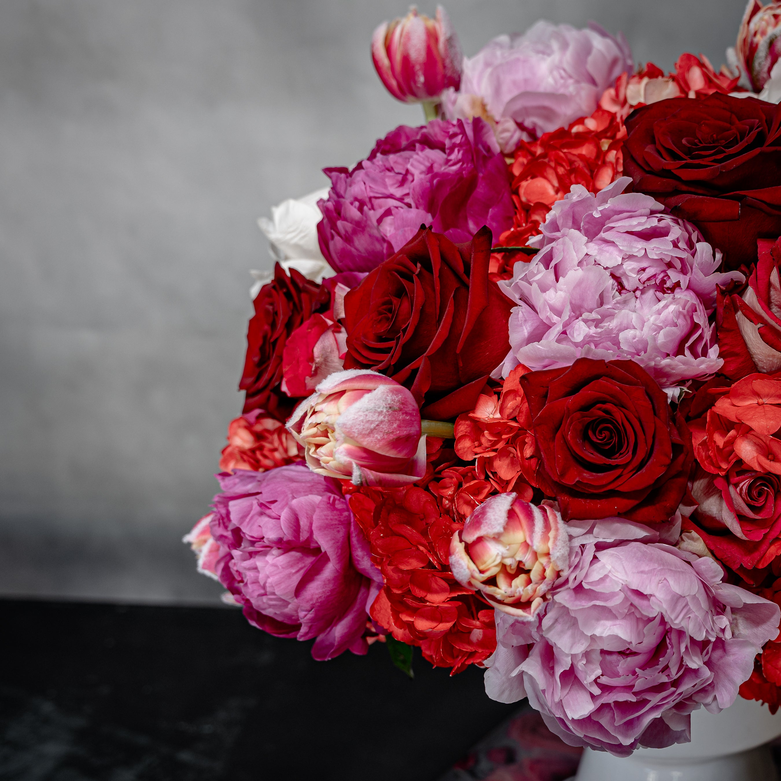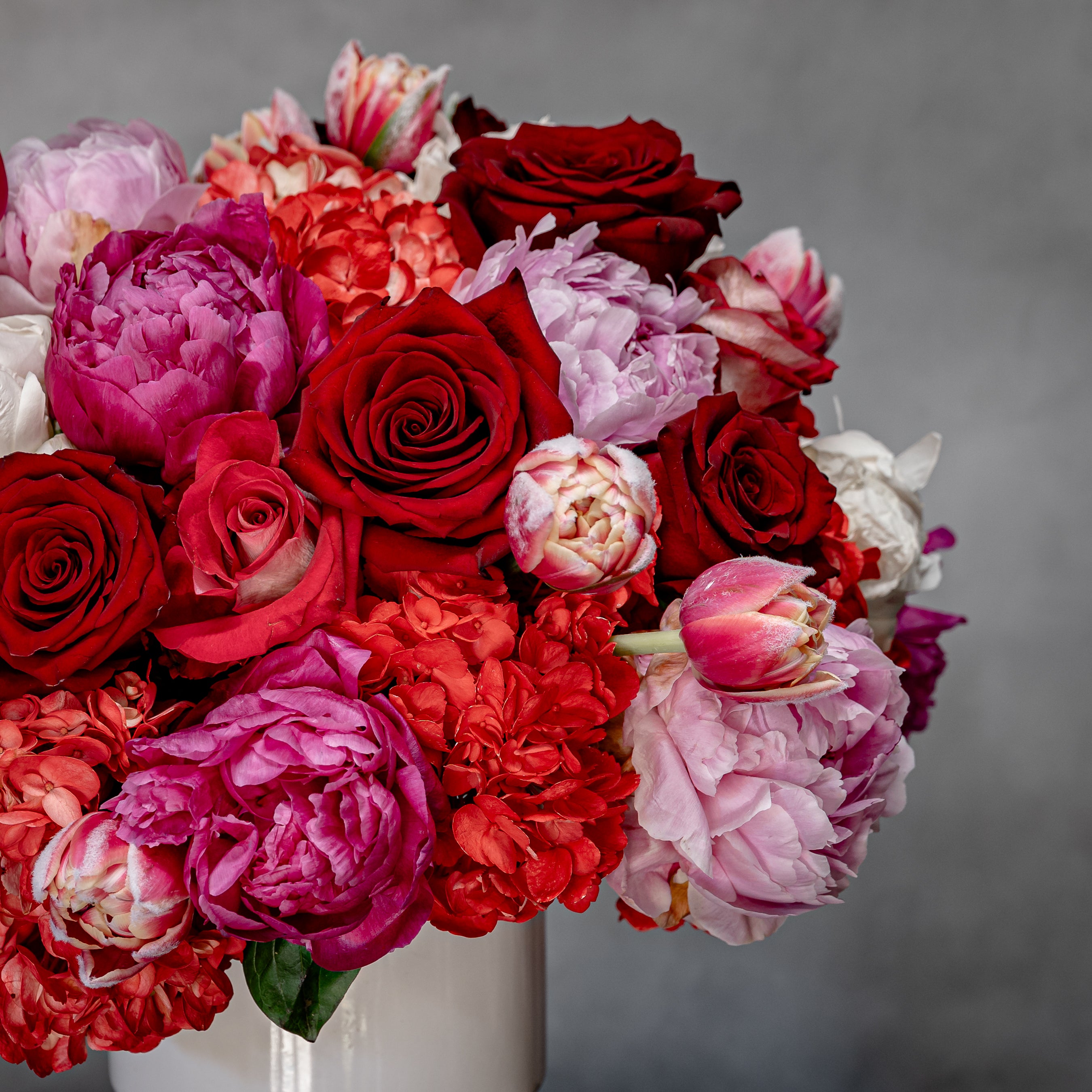 Ube Bebe is a heartfelt masterpiece, overflowing with vibrant hues and exquisite blooms. Featuring rich roses, eye-catching Colombian red hydrangeas, and stunning Dutch coral peonies, this lush bouquet is designed to captivate and delight. Arranged in a 9-inch modern ceramic vase, this bold 18” tall and 16” wide arrangement is accented with seasonal florals to enhance its charm and elegance. Perfect for expressing love, gratitude, or celebration.