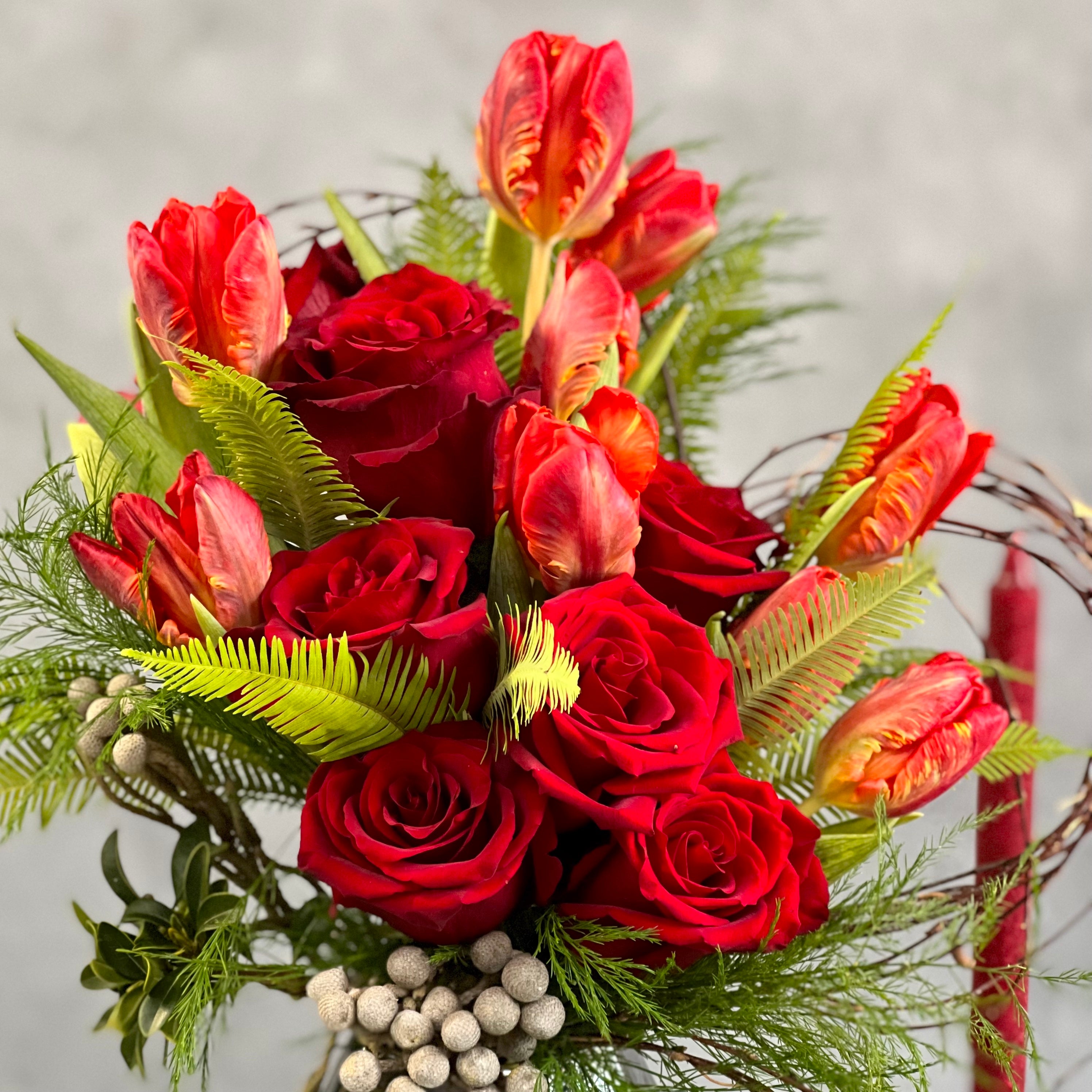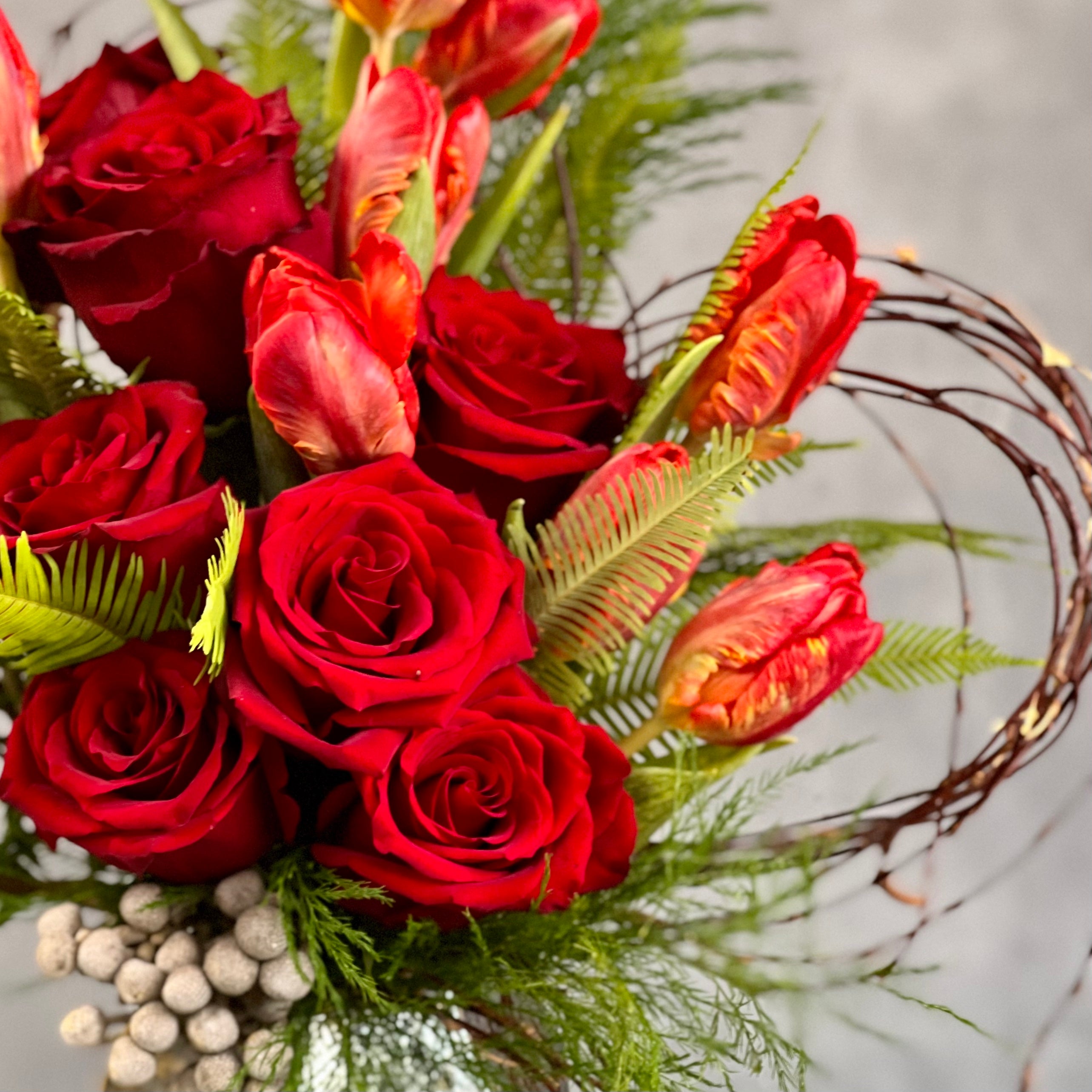 A Beautiful Display of Roses and Tulips with Burch Heart with Accents of Berries in a Clear Gold Geometric Vase.