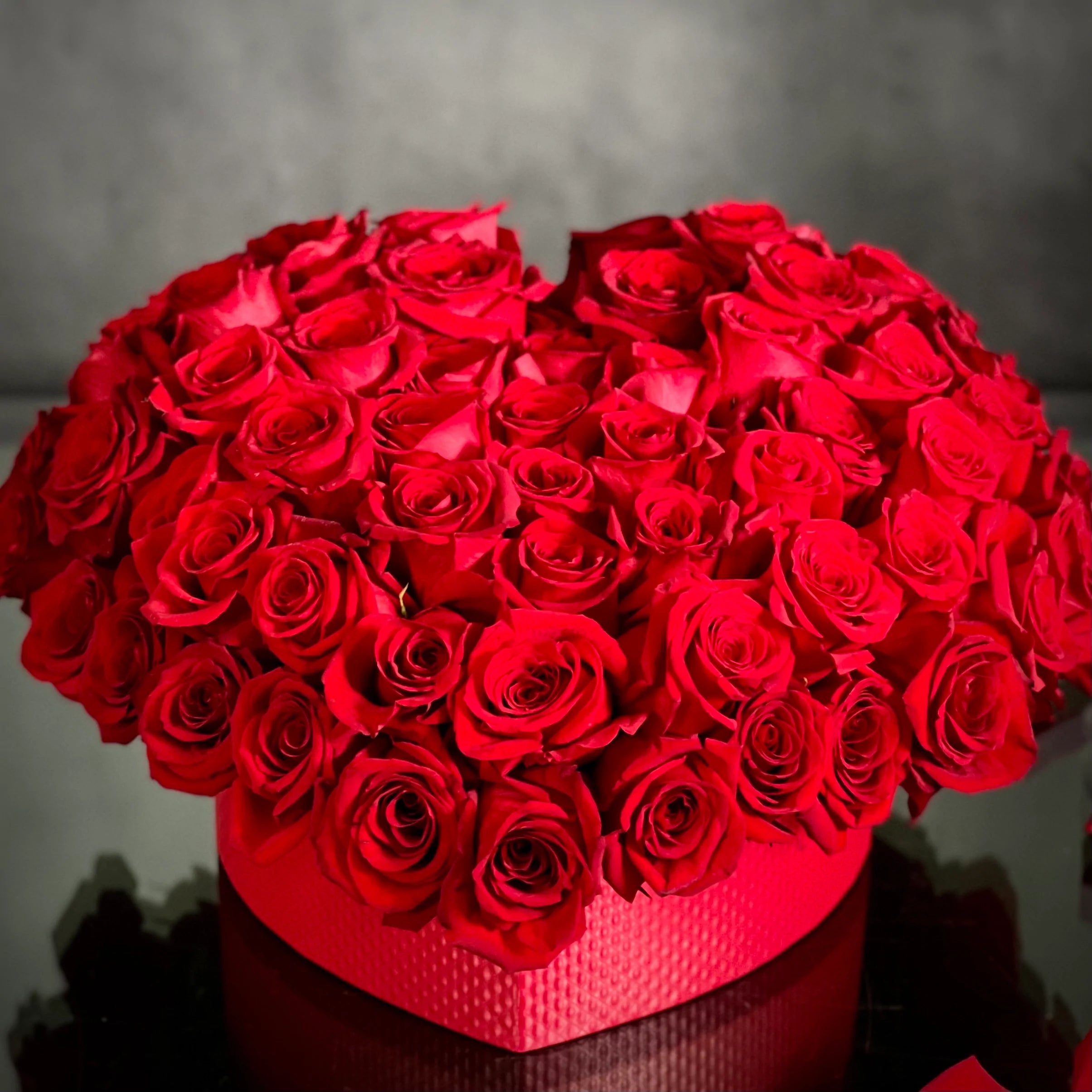 Dozens amd dozens of gorgeous bright Red South American Roses fill this heart-shaped box with sentiments also over the top… Say I LOVE YOU in a BIG WAY!!!!!