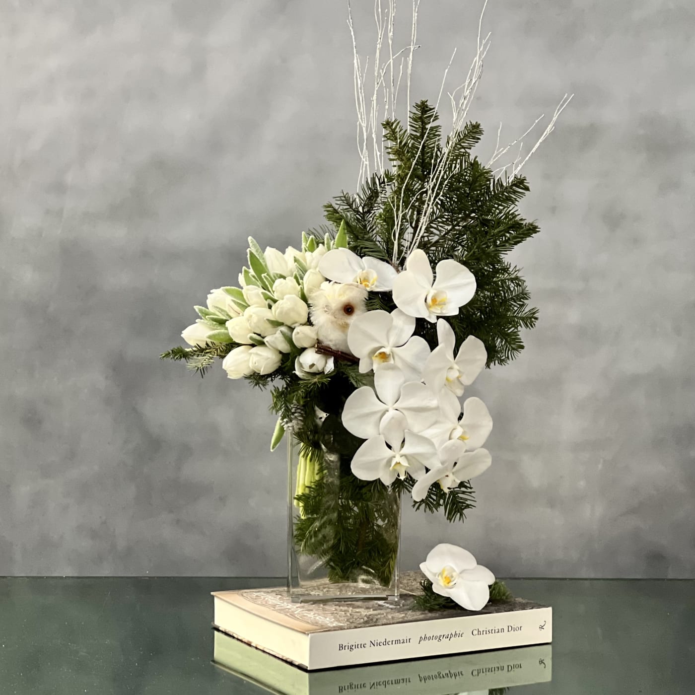 Celebrate the season with our “White Holiday Tulips” arrangement, a stunning combination of elegance and festive cheer. This exquisite display features fresh white tulips and cascading orchids, beautifully arranged within a sleek glass vase and accented with lush seasonal holiday greens. Perfect for gifting or as a sophisticated centerpiece, this arrangement adds a touch of refinement to any holiday décor.