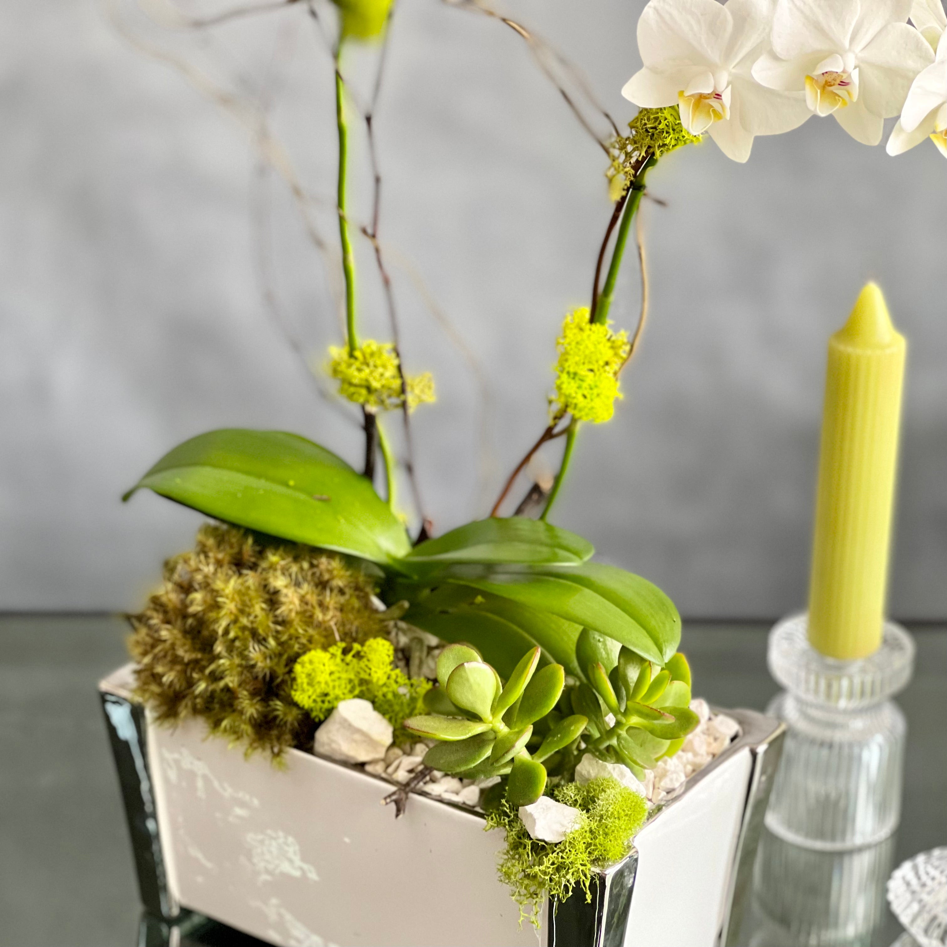 Beverly Hills Florist presents 2 lovely and delicate mini White Orchid plants accented succulents with in a white modern ceramic container. A designer floral piece that is charming and impressive. This arrangement is perfect for any occasions like birthday, get well, thank you, sympathy, congrats, love and romance.