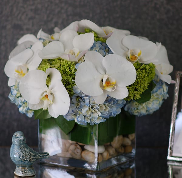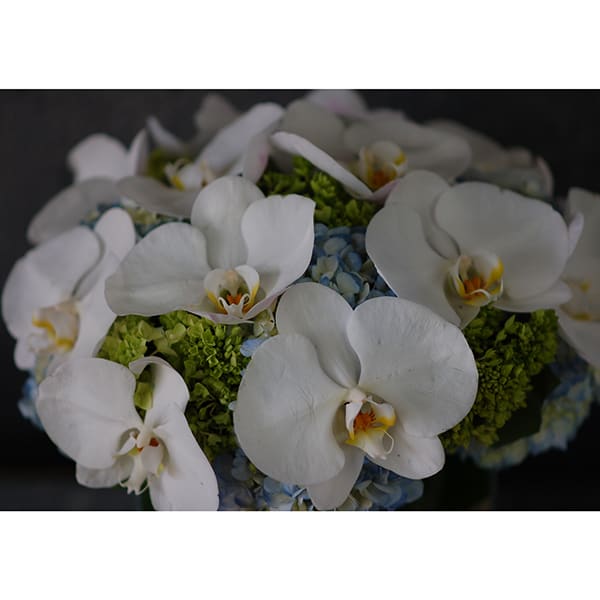 A delicate and soft arrangement of blue and green Indonesian Hydrangeas arranged in a glass vase, accented with imported white Orchids. It will enhance the ambiance of any room or office and your recipient will surely appreciate its beauty.