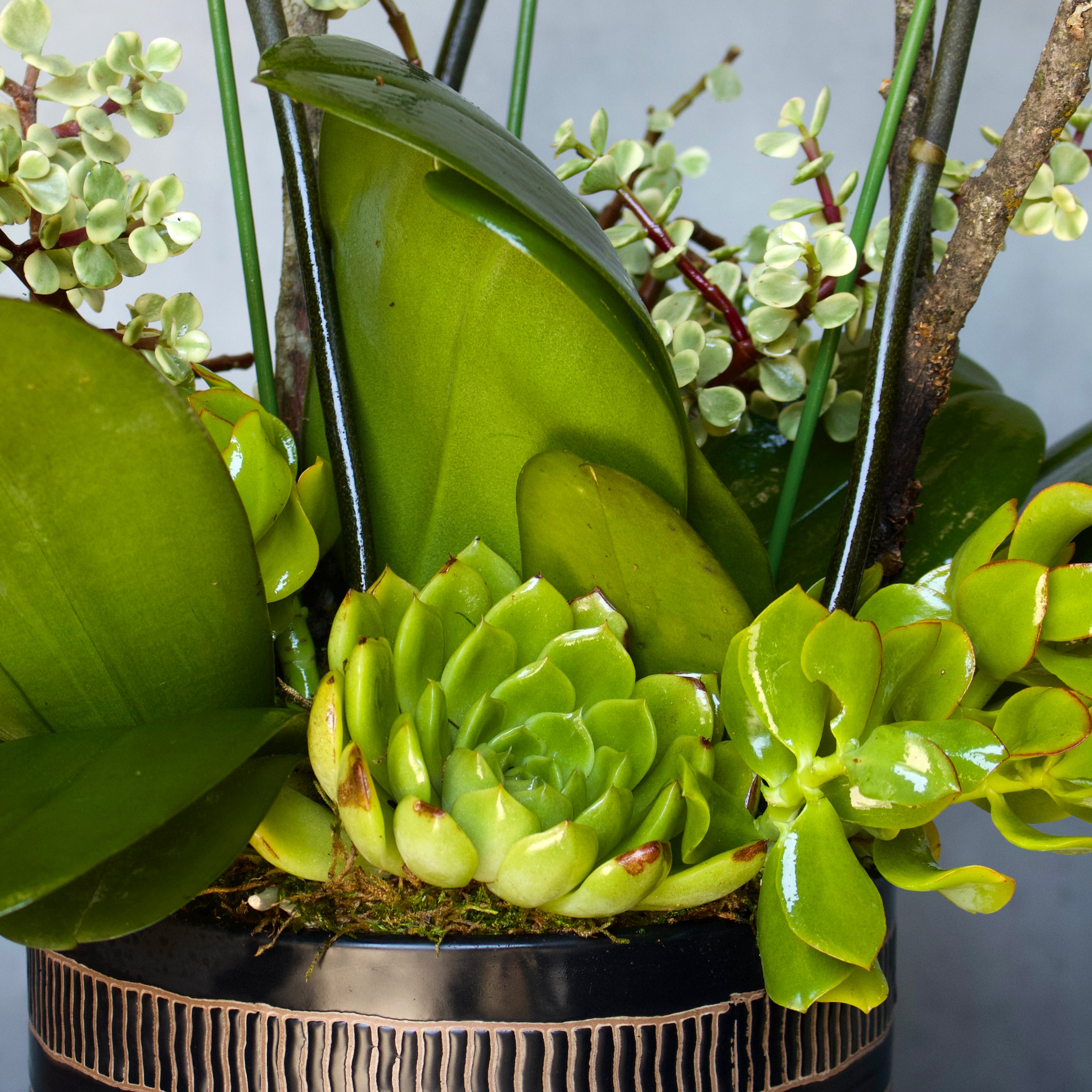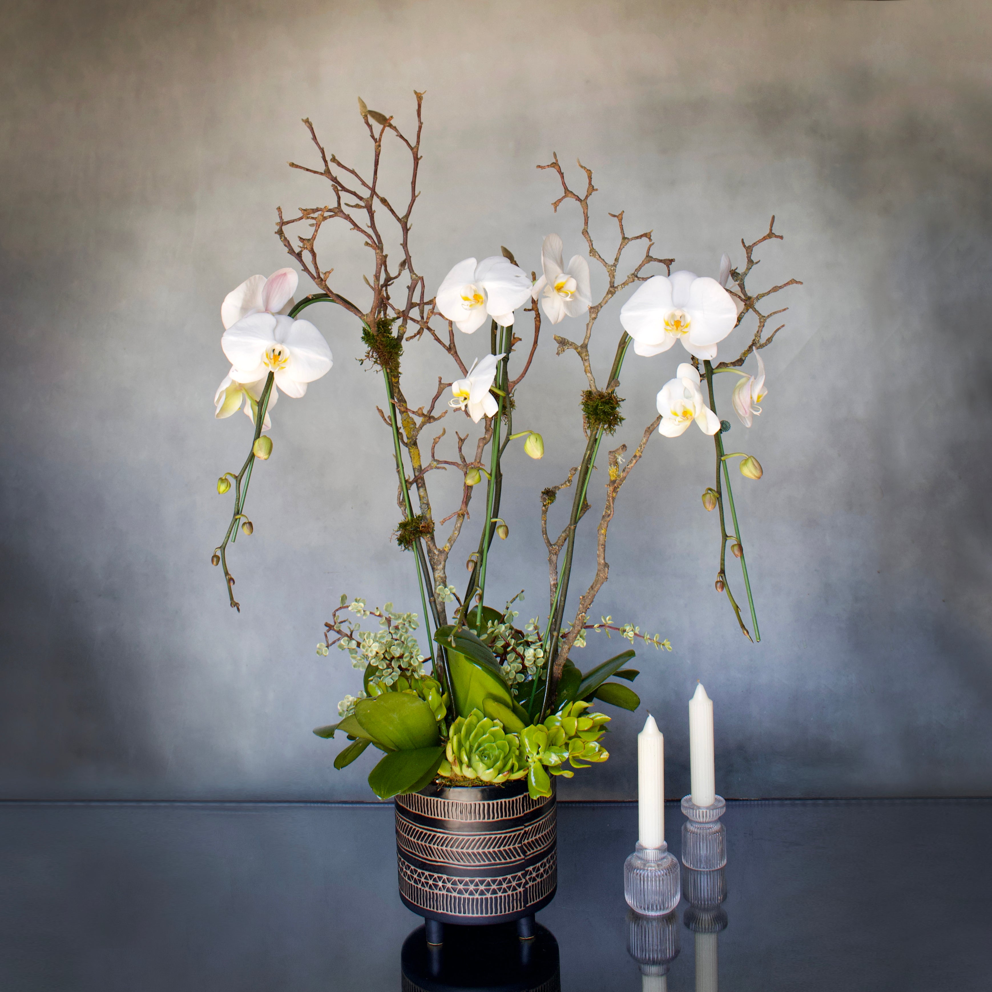 3 spikes orchids standing tall accented with succulents in a pedestal vase.