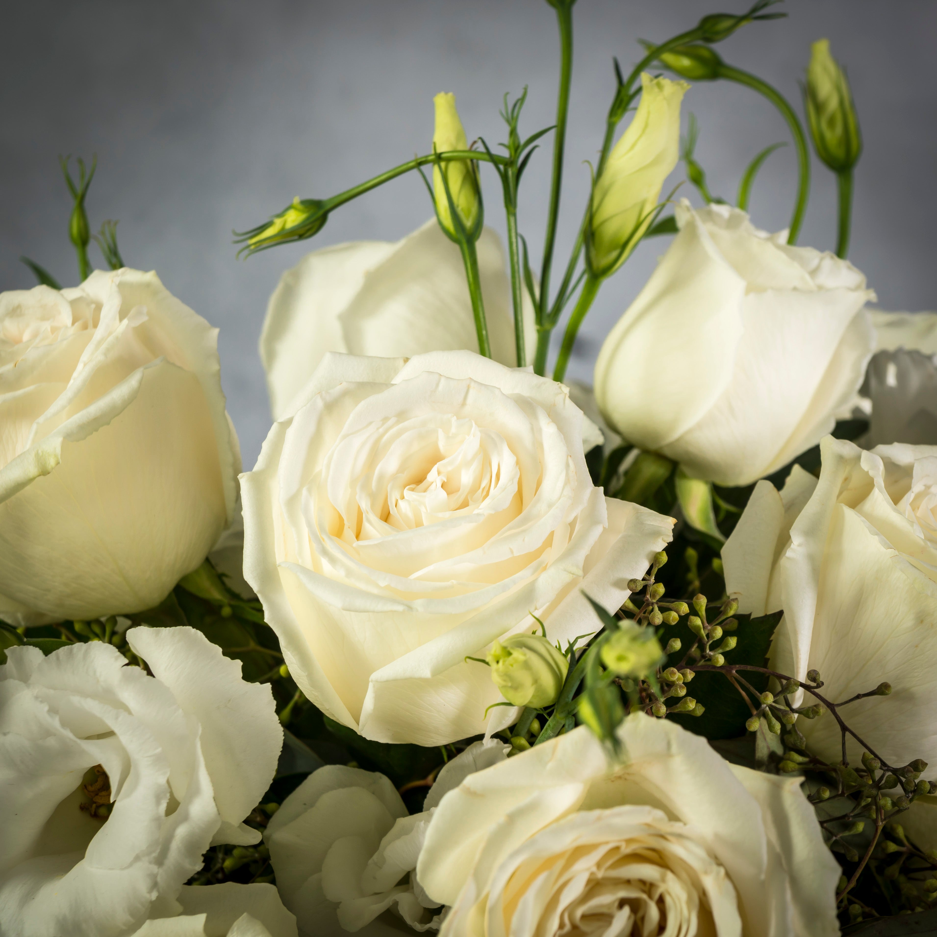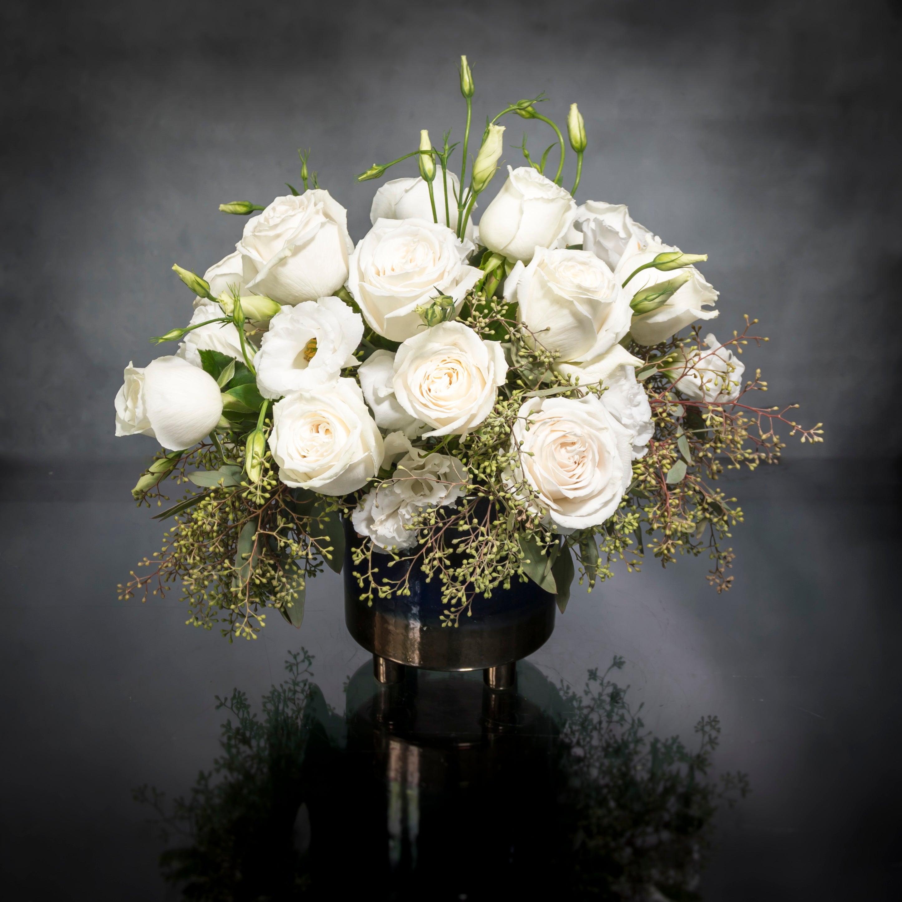 Beverly Hills Florist presents this is a beautiful marriage of two varieties of flowers for same day delivery … Lisianthus and Roses nested on seasonal greens in a blue and gold footed vase.
